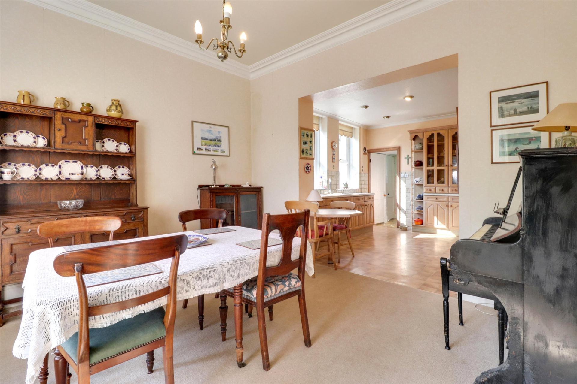 The open-plan kitchen and dining area forms the heart of the home a welcoming and versatile space ideal for family life and entertaining. The dining area comfortably accommodates a family table and chairs, creating a warm setting for everyday meals or more formal gatherings. It flows seamlessly into the expansive kitchen, which offers ample workspace and storage, further enhancing the functionality and charm of this sociable hub.