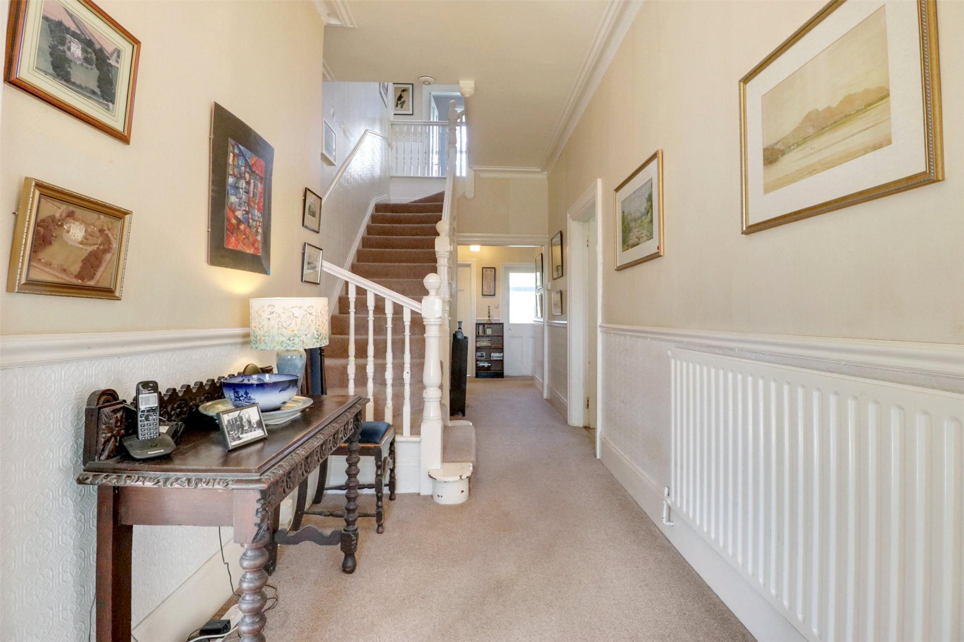 This attractive property is accessed through imposing wooden gates, opening onto a sweeping gravel driveway with ample space for multiple vehicles. From here, an elegant tiled porch welcomes you into the home, leading into a light and airy entrance hallway. Beautifully appointed with traditional features such as dado rails and ornate cornices, the hallway provides access to all the principal reception rooms, setting the tone for the period charm found throughout the property.