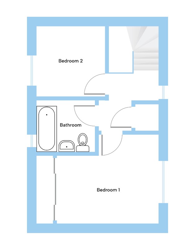 The first floor has two bedrooms, with bedroom 1 having a large fitted wardrobe, and a family bathroom.