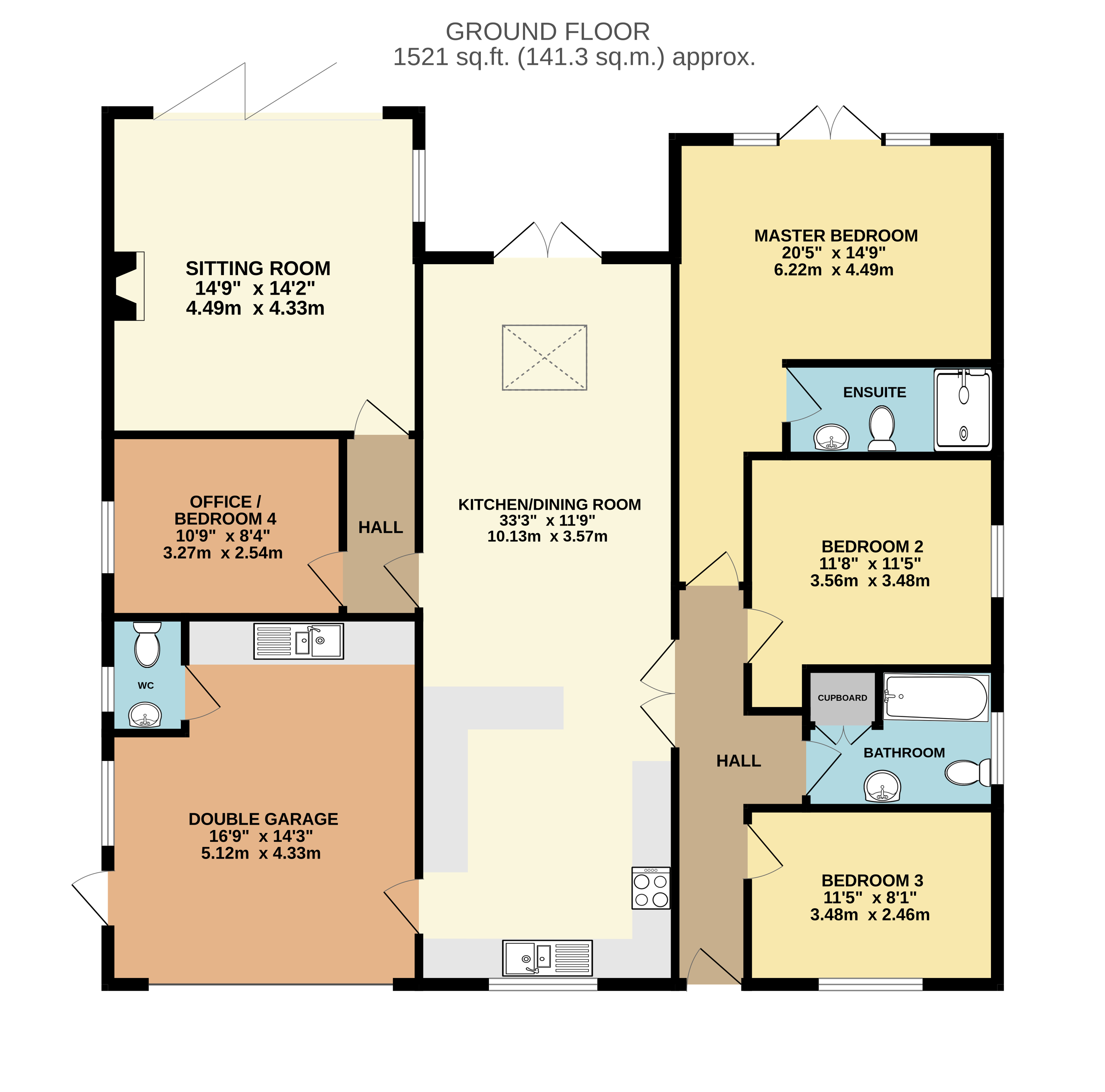 The property is completed by three further double bedrooms, including a master bedroom that overlooks the rear garden and benefits from French doors opening directly onto the outside space. The master also features an en-suite, fitted with a walk-in shower, WC, and hand wash basin.