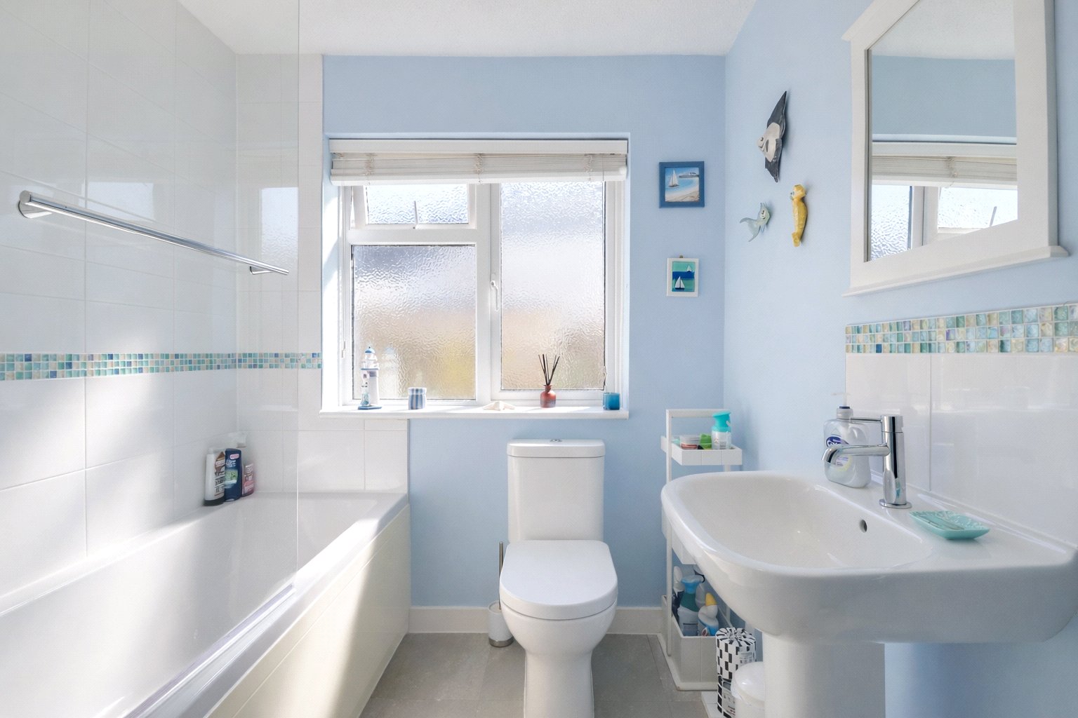 From the front door you step into a central hallway that provides access to all the main rooms. From here, there is also entry to the primary family bathroom, which is fitted with a WC, wash basin, and a bath with a shower overhead.