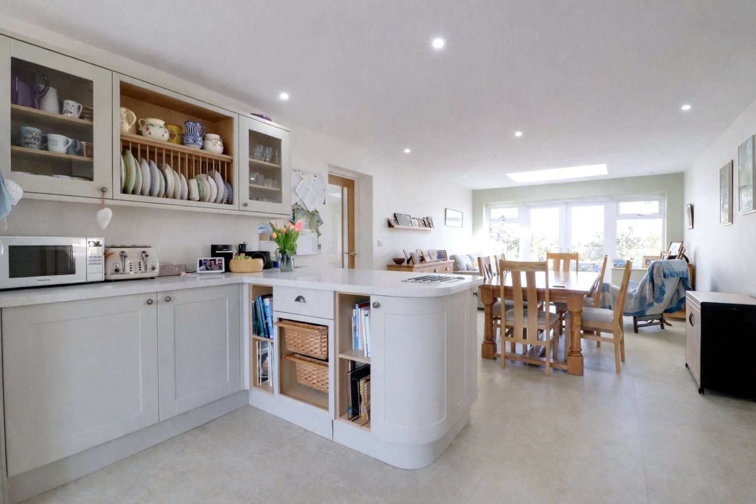 Wooden double doors lead from the hallway into an open plan, modern fitted kitchen / dining room offering excellent space for entertaining friends and family. The kitchen features a timeless shaker style cabinet with quartz worktop with integrated induction hob, electric oven and dishwasher with further space for freestanding appliances.