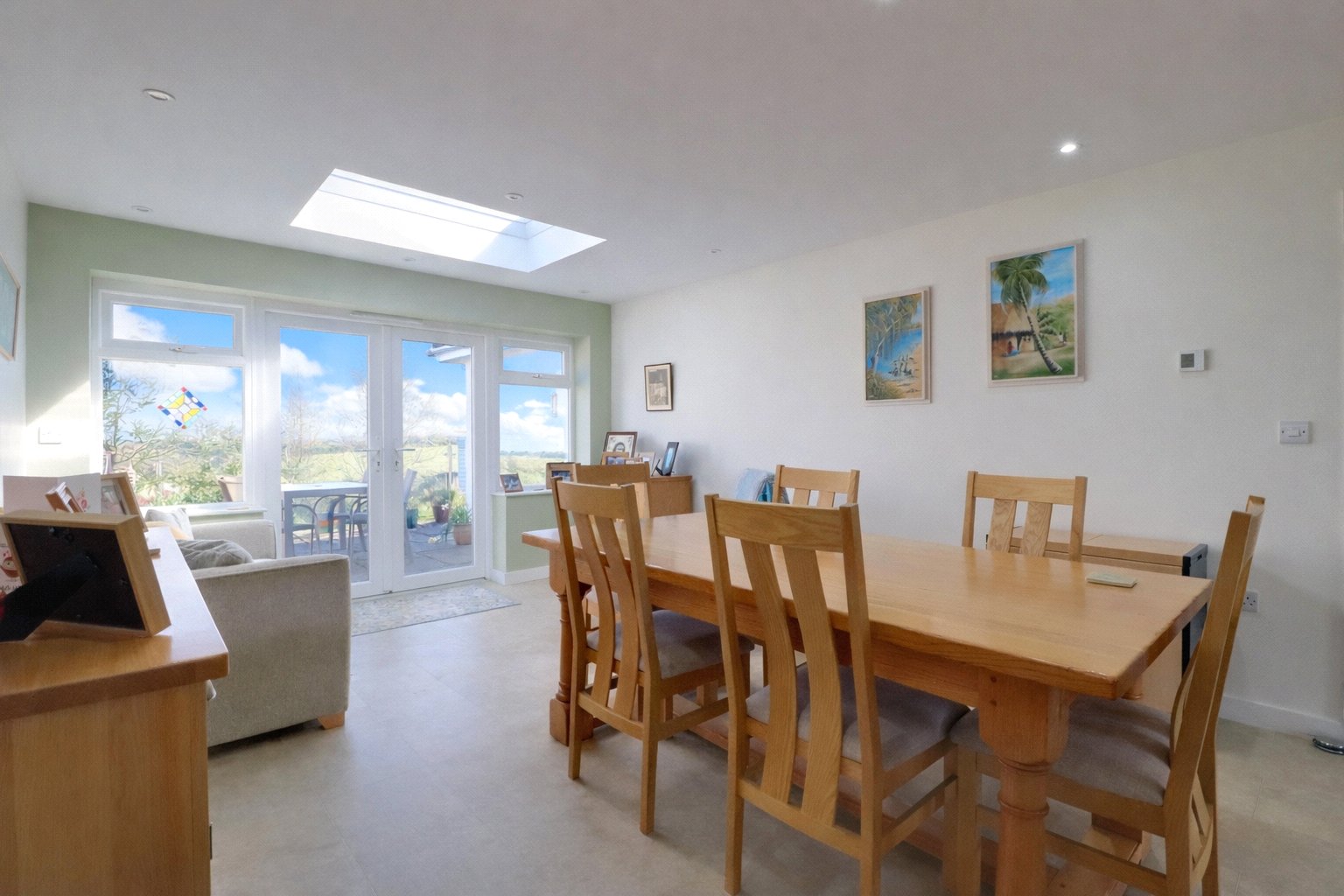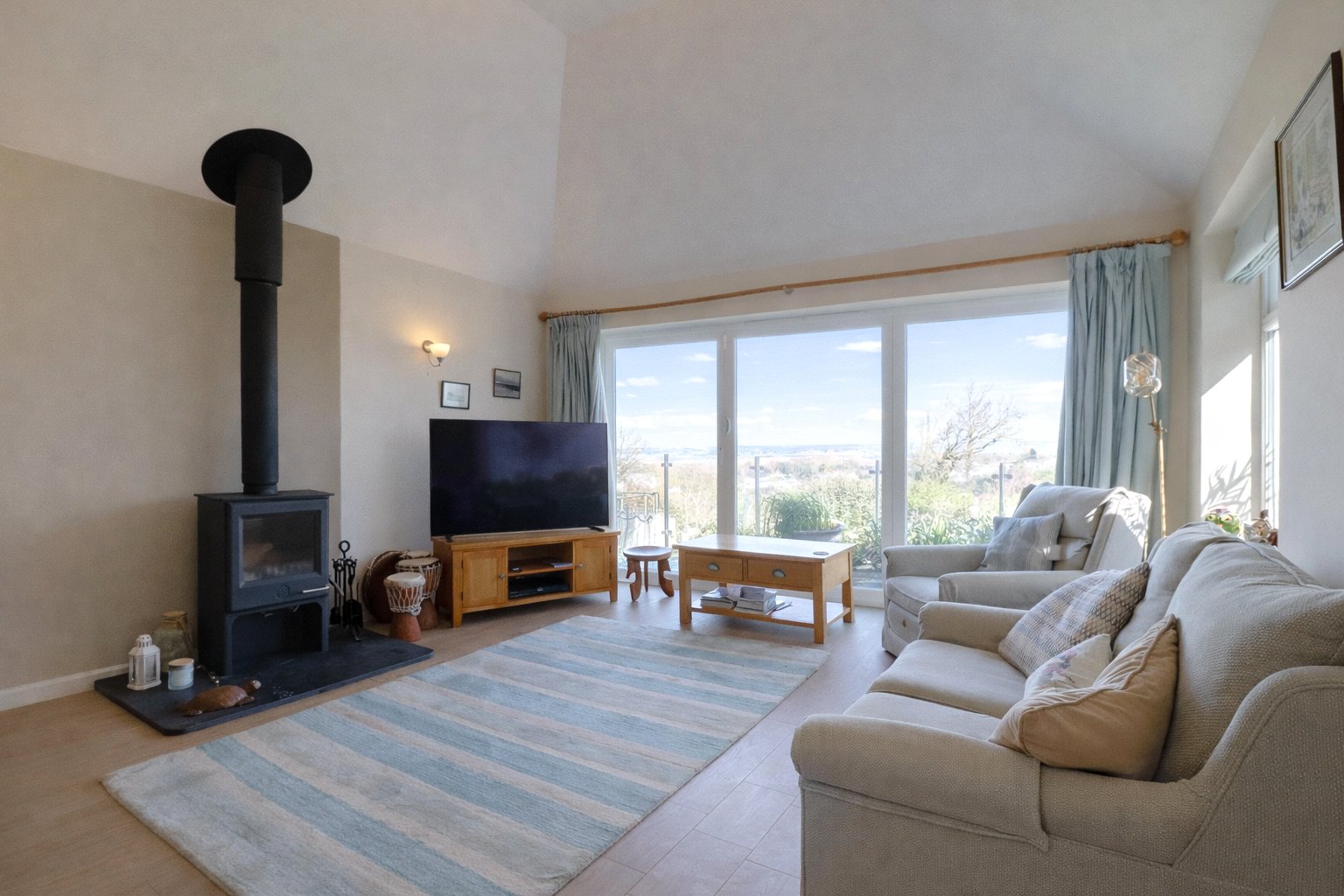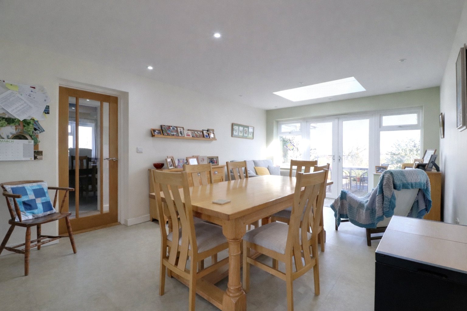 Flowing from the dining area is a smaller inner hallway, leading to a versatile home office or potential fourth bedroom, as well as a rear-facing sitting room. This spacious sitting room comfortably accommodates substantial furniture and features a central wood-burning fireplace. Large bifolding doors open out to overlook the rear garden and surrounding countryside.