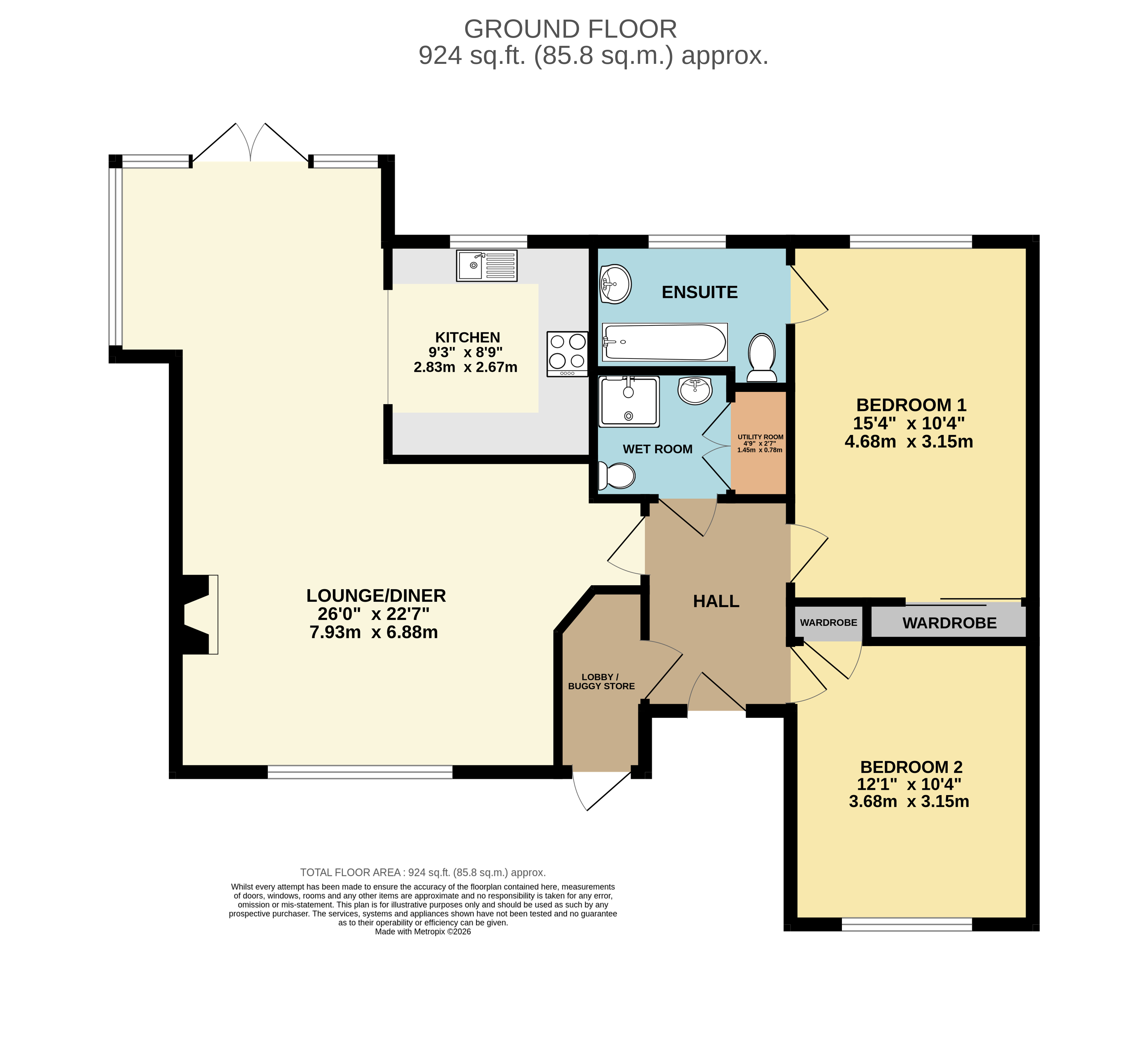 Completing the accommodation is a fully accessible wet room, fitted with a contemporary white suite. A large built-in cupboard provides space and plumbing for washing machine/dryer creating a practical utility area.