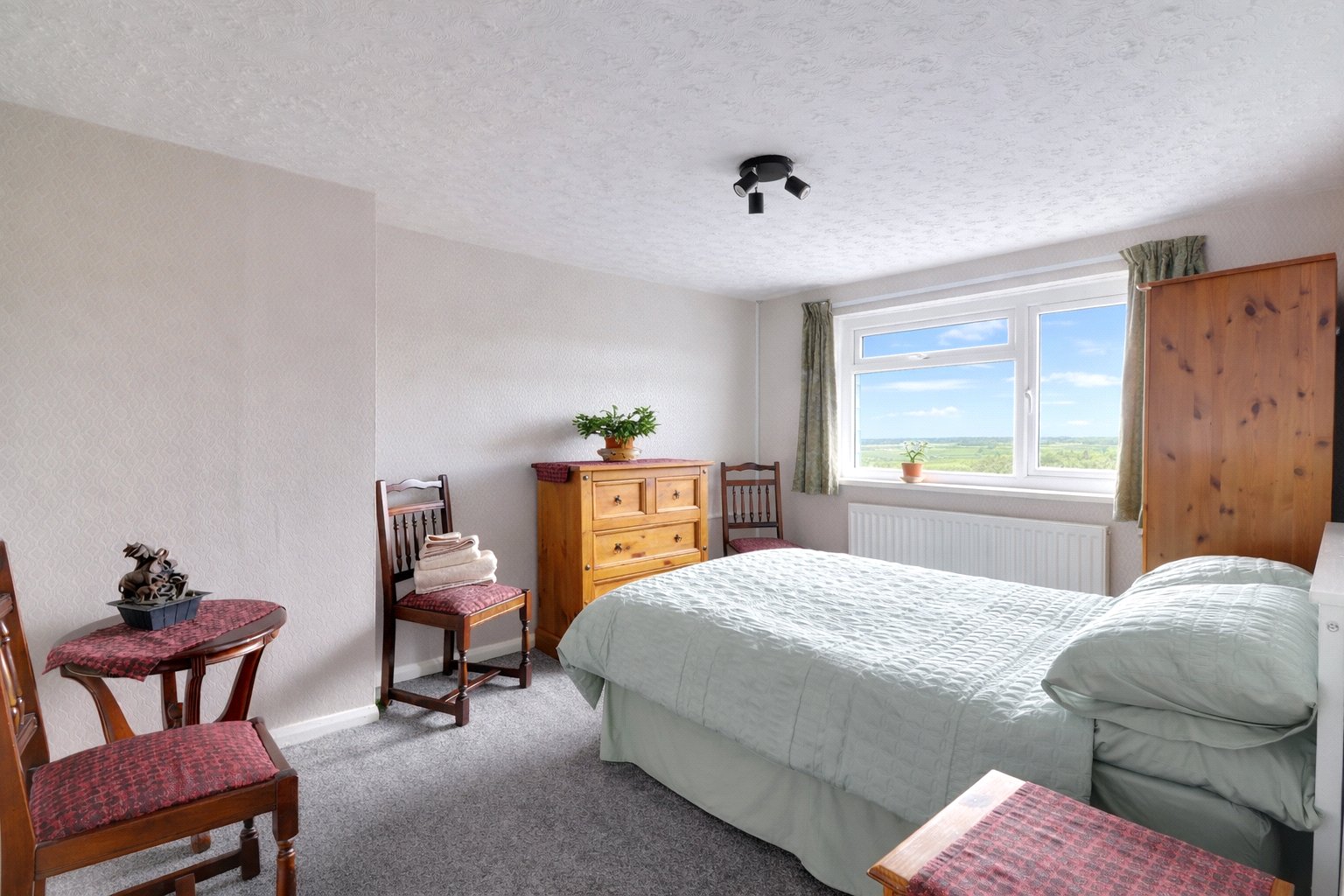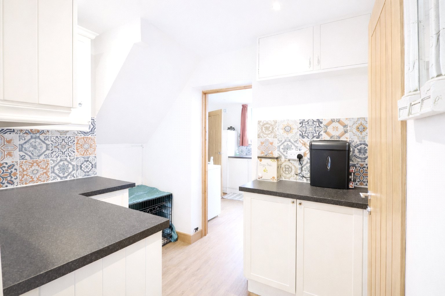 On the other side of the house, the kitchen is well arranged with matching wall and floor units and a cooker. There is freestanding space and plumbing for a large fridge freezer, plus a useful pantry cupboard for storage. A window over the sink looks out across the garden and the wider views beyond.