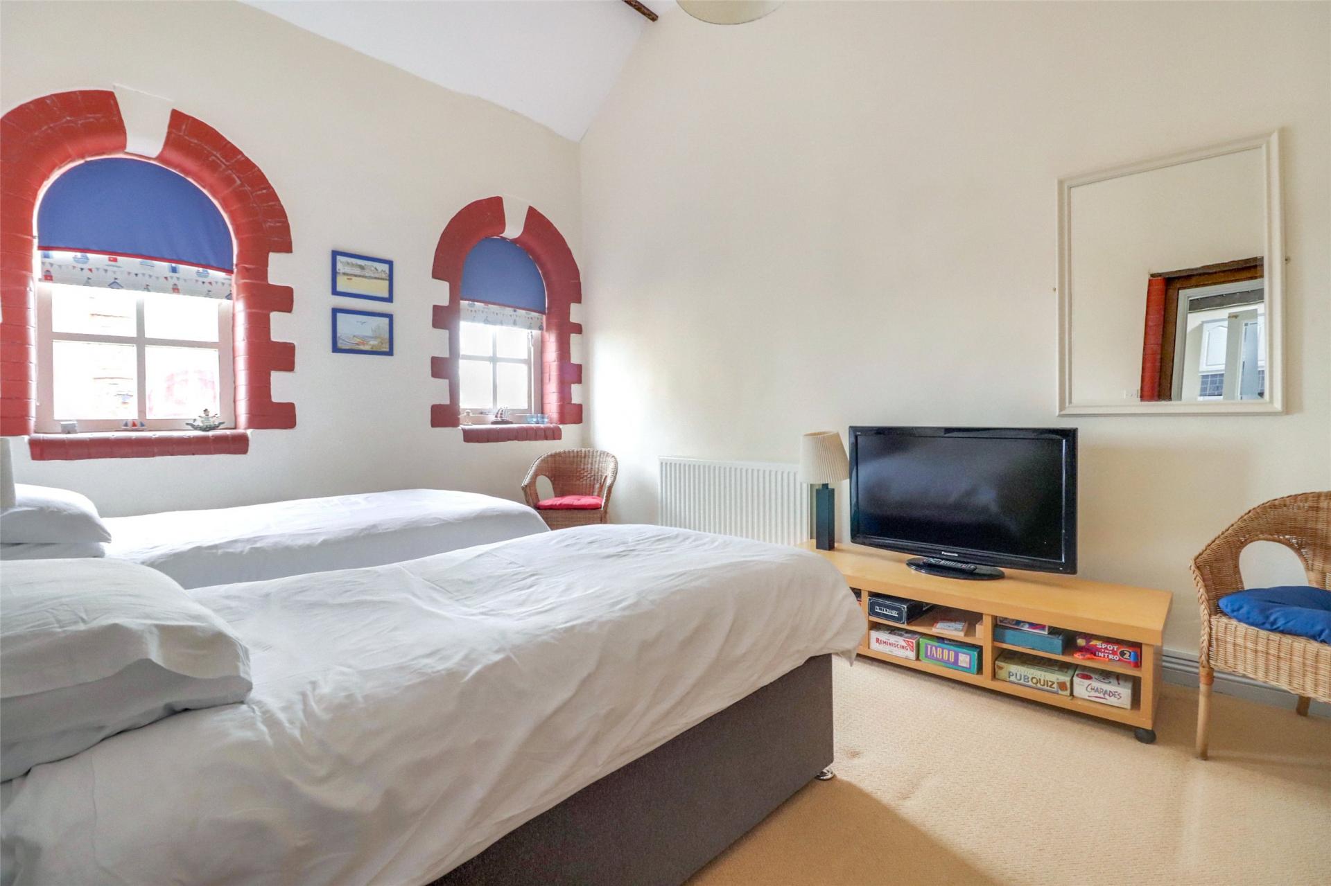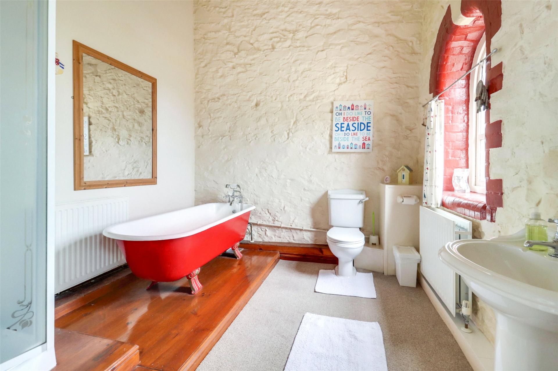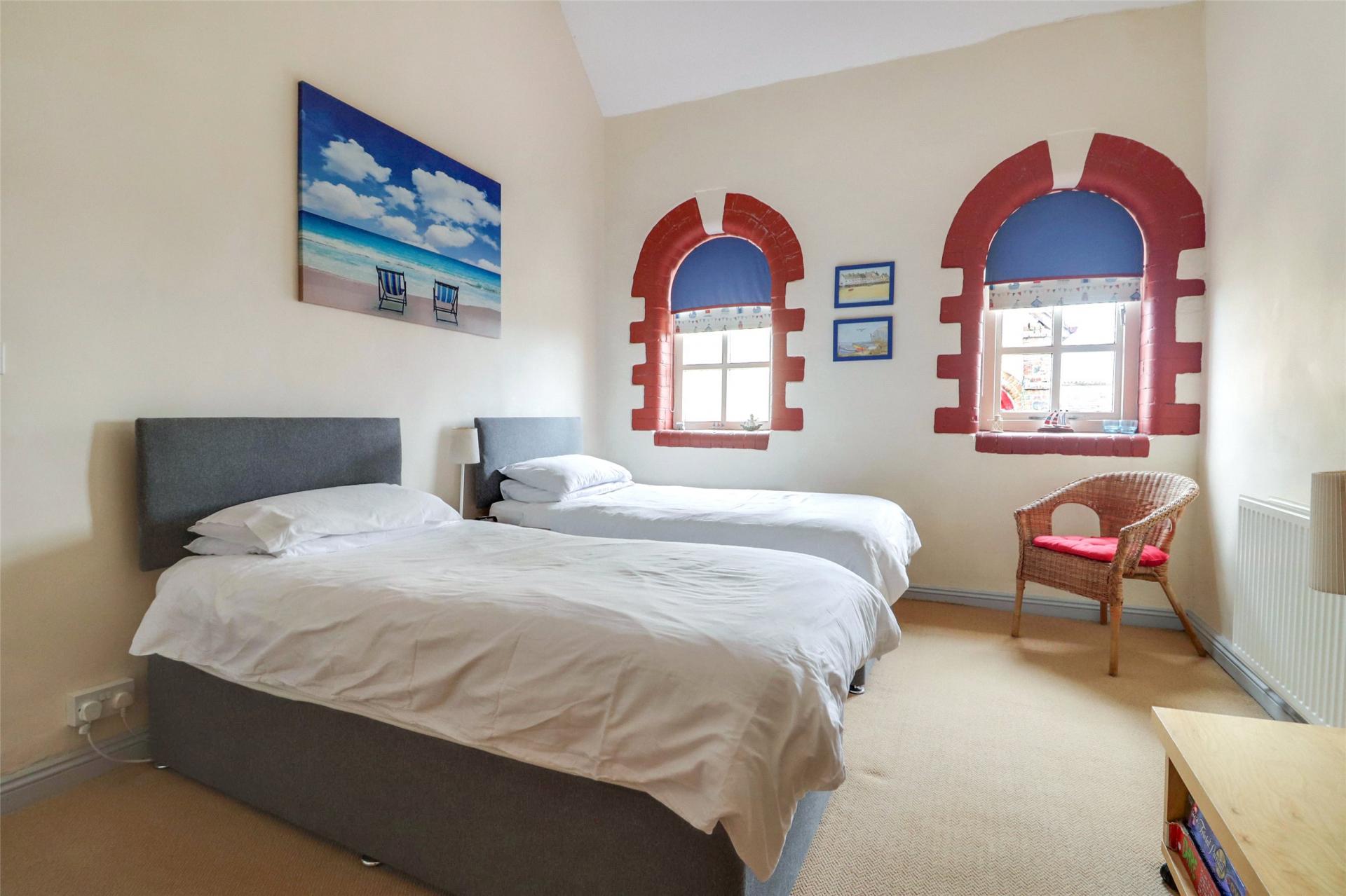 Bedroom one has a vaulted ceiling with exposed A-frames and a roof window. The bathroom has a window to the front elevation with sea views. It comprises of a pedestal wash hand basin, low level WC, a shower cubicle and a roll top claw footed bath. There is also a vaulted ceiling with exposed timbers. Bedroom two has a part vaulted ceiling with an exposed beam, two windows to the front elevation with sea glimpses and a built-in wardrobe that also houses the wall mounted LPG gas fired boiler.