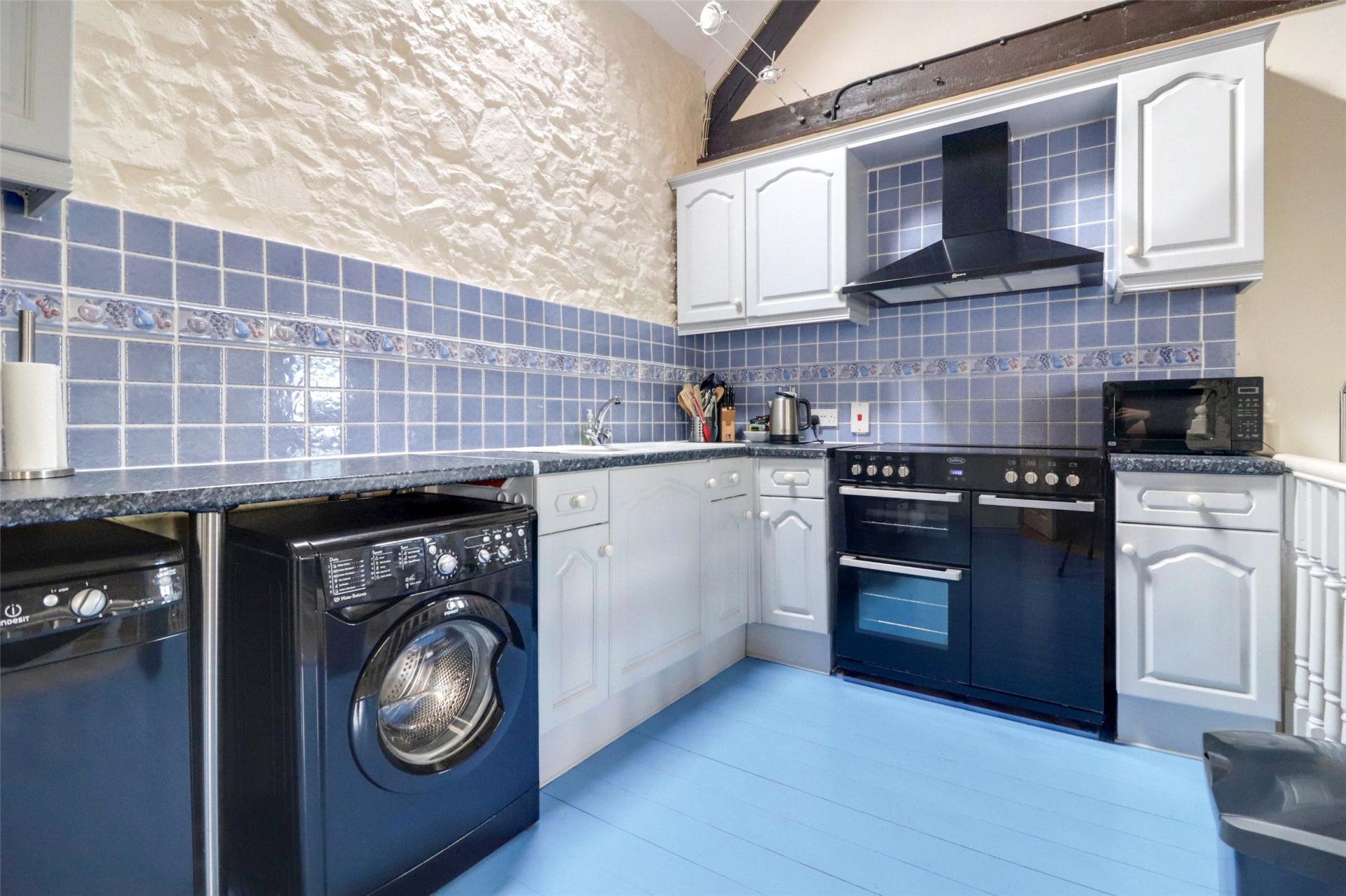 The kitchen area is slightly raised with a timber floor. There is an excellent range of matching wall and base units with a sink unit set into roll top work surfaces with tiled splash backs. There is an integrated fridge freezer, Range style cooker with extractor over and also space for a washing machine and dishwasher.