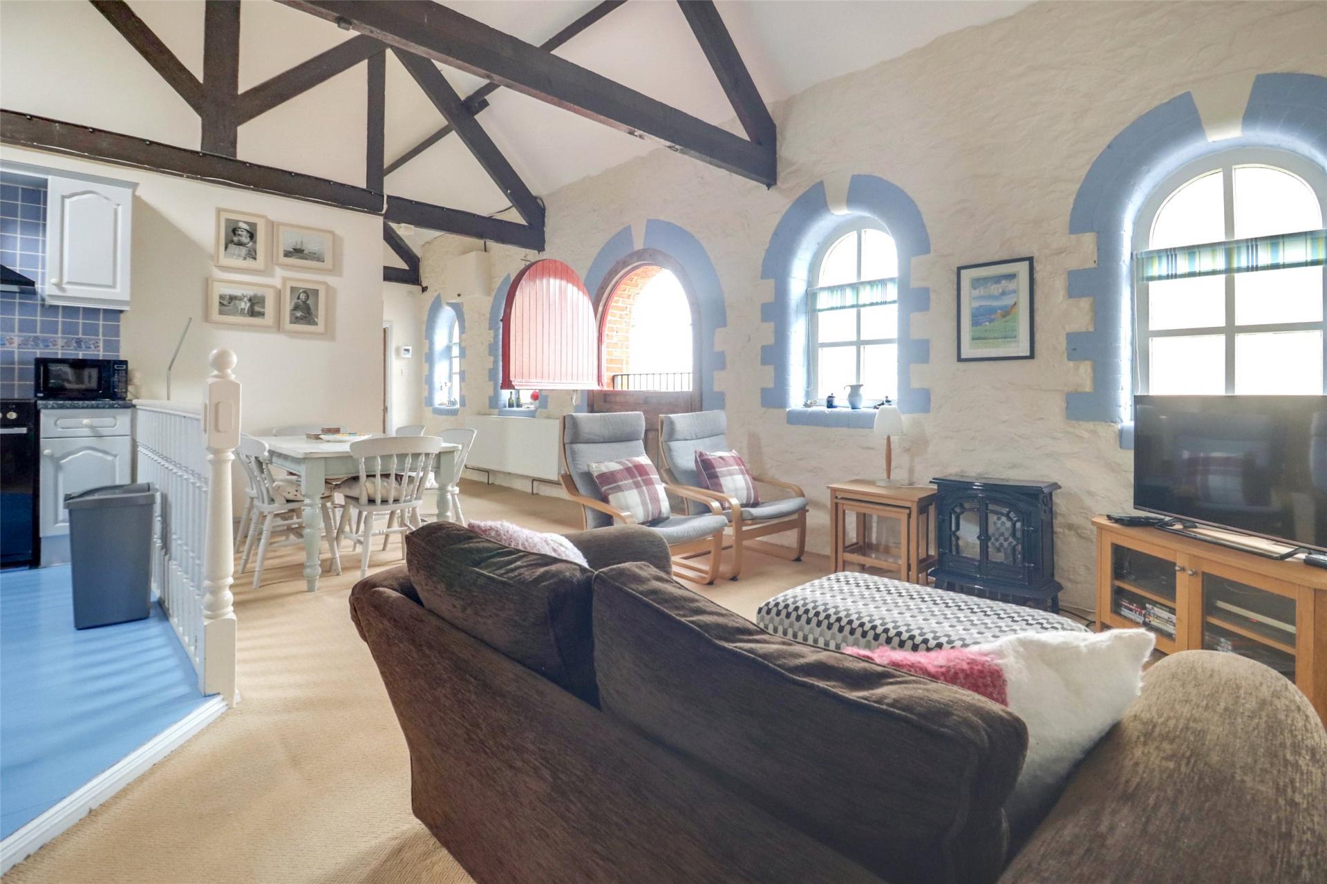 A glazed door then leads to the open plan living area that incorporates the sitting room / dining area and the kitchen which spans across the breath of the first floor. This room has vaulted ceilings with exposed A-frames and four windows to the front elevation with sea views. There is also a large arched stable door with a Juliette balcony enjoying the sea views on offer.