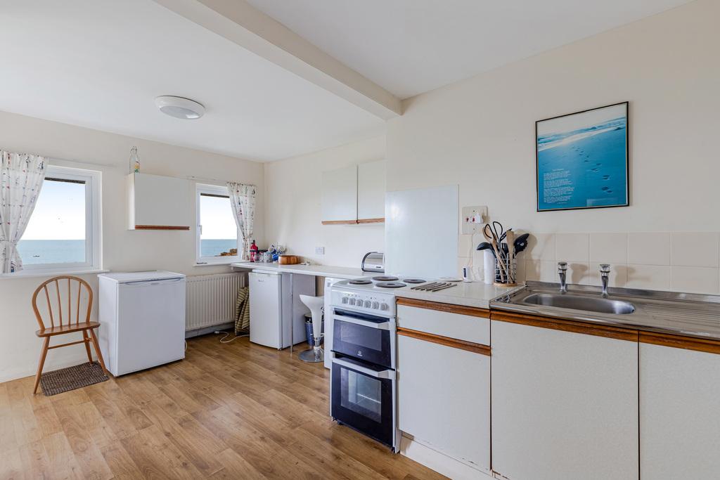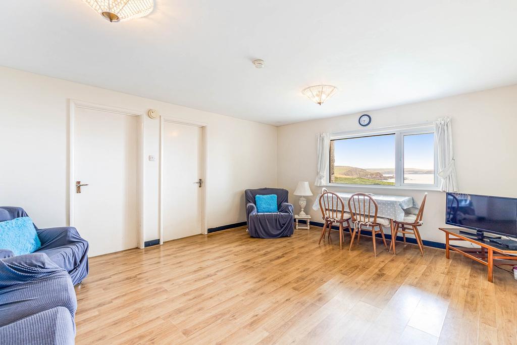 The layout flows seamlessly, starting with a porch and cloakroom leading to all principal rooms. A light-filled sitting room opens onto a superb balcony perfectly placed to take in the sweeping coastal scenery. The kitchen includes ample storage and a picture window that captures captivating views over the beaches and open sea. This main level also provides two double bedrooms and a family bathroom.