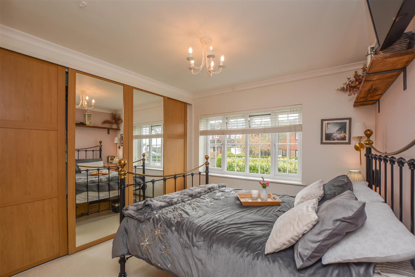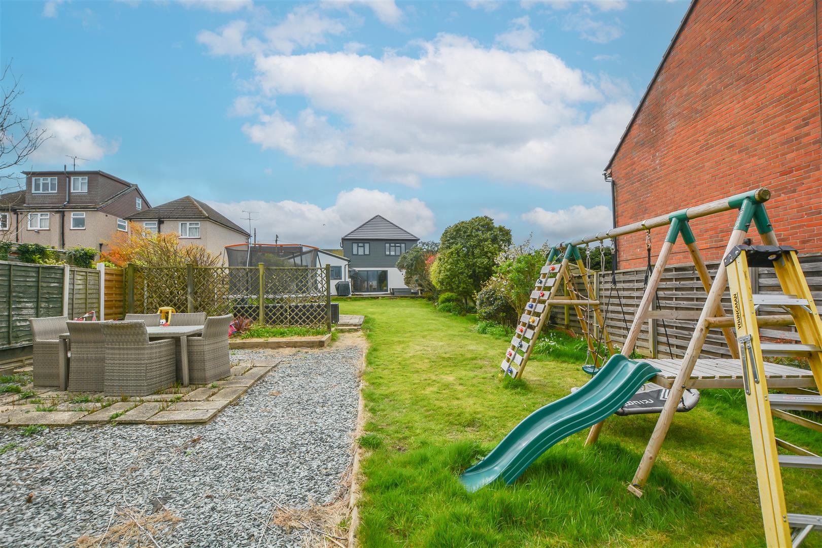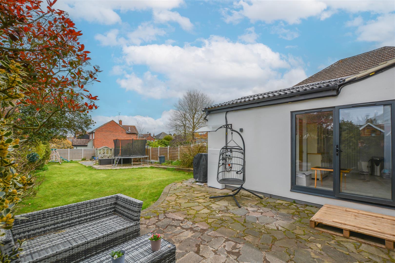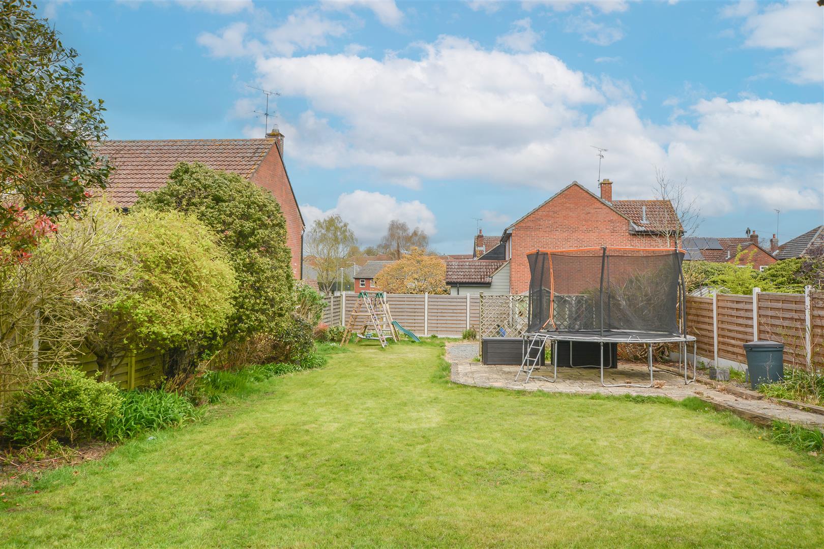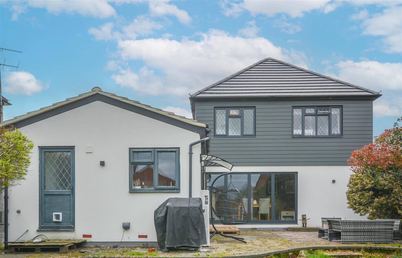 Externally, the rear garden features a paved seating area leading to a generous lawn with mature shrub borders. To the front, a spacious driveway provides ample off-street parking.