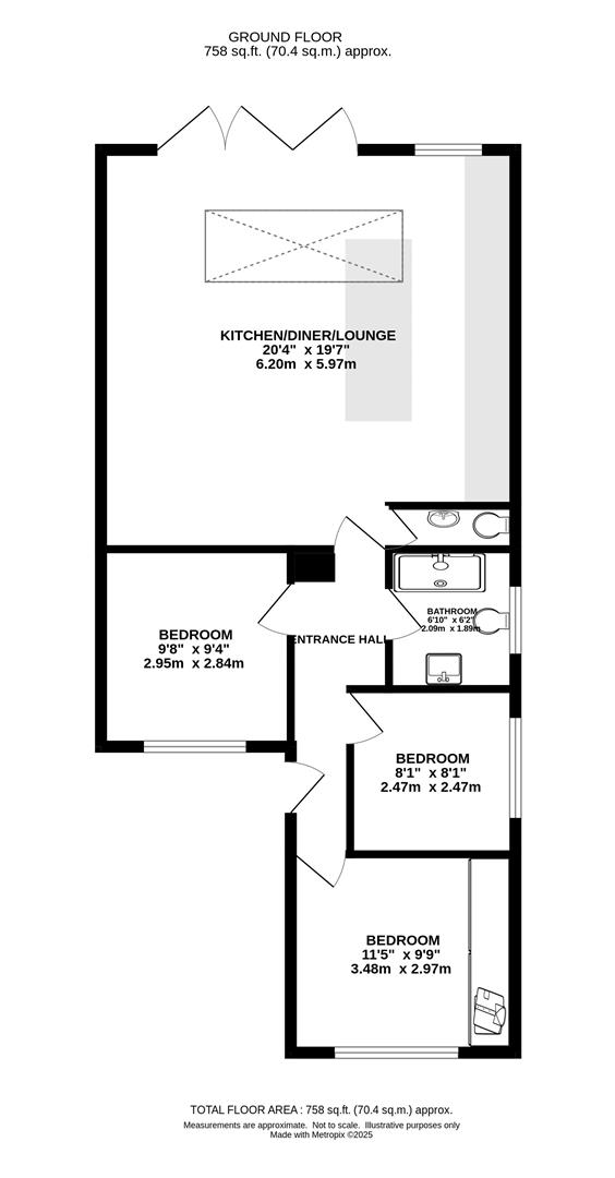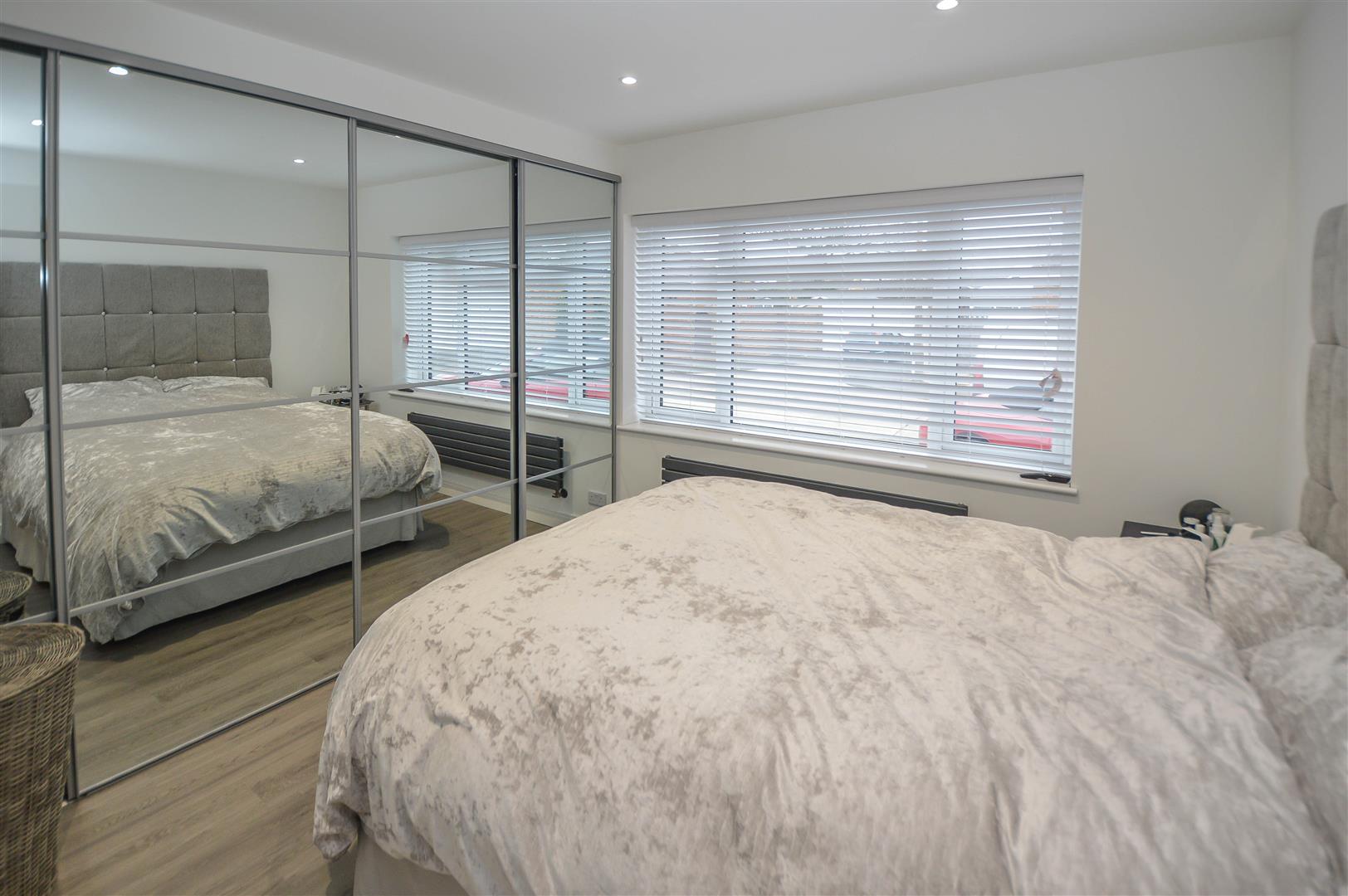 The principal bedroom, located at the front of the property, features built-in wardrobes that span an entire wall, offering ample storage. Two additional well-proportioned bedrooms provide versatility, while the luxurious, fully tiled bathroom includes a walk-in shower, a hand wash basin set within a vanity unit, and a close-coupled WC. A convenient cloakroom completes the interior.