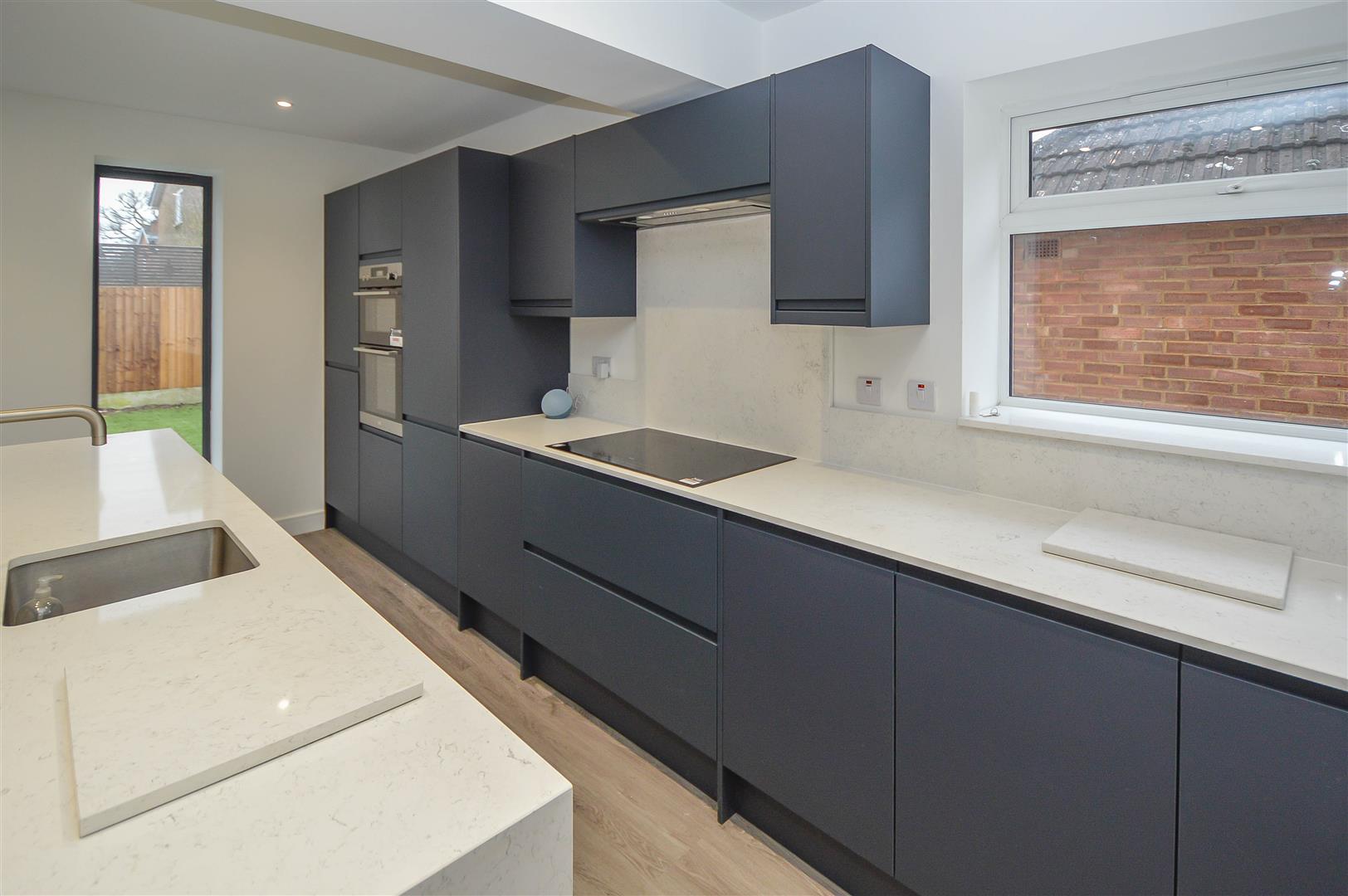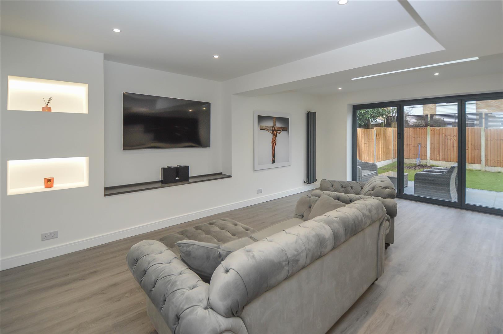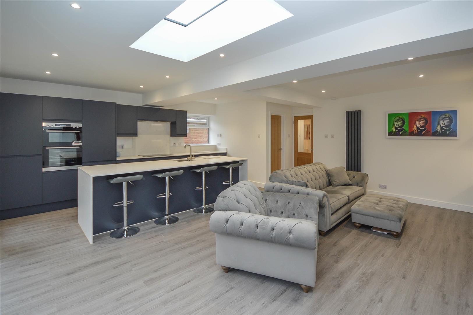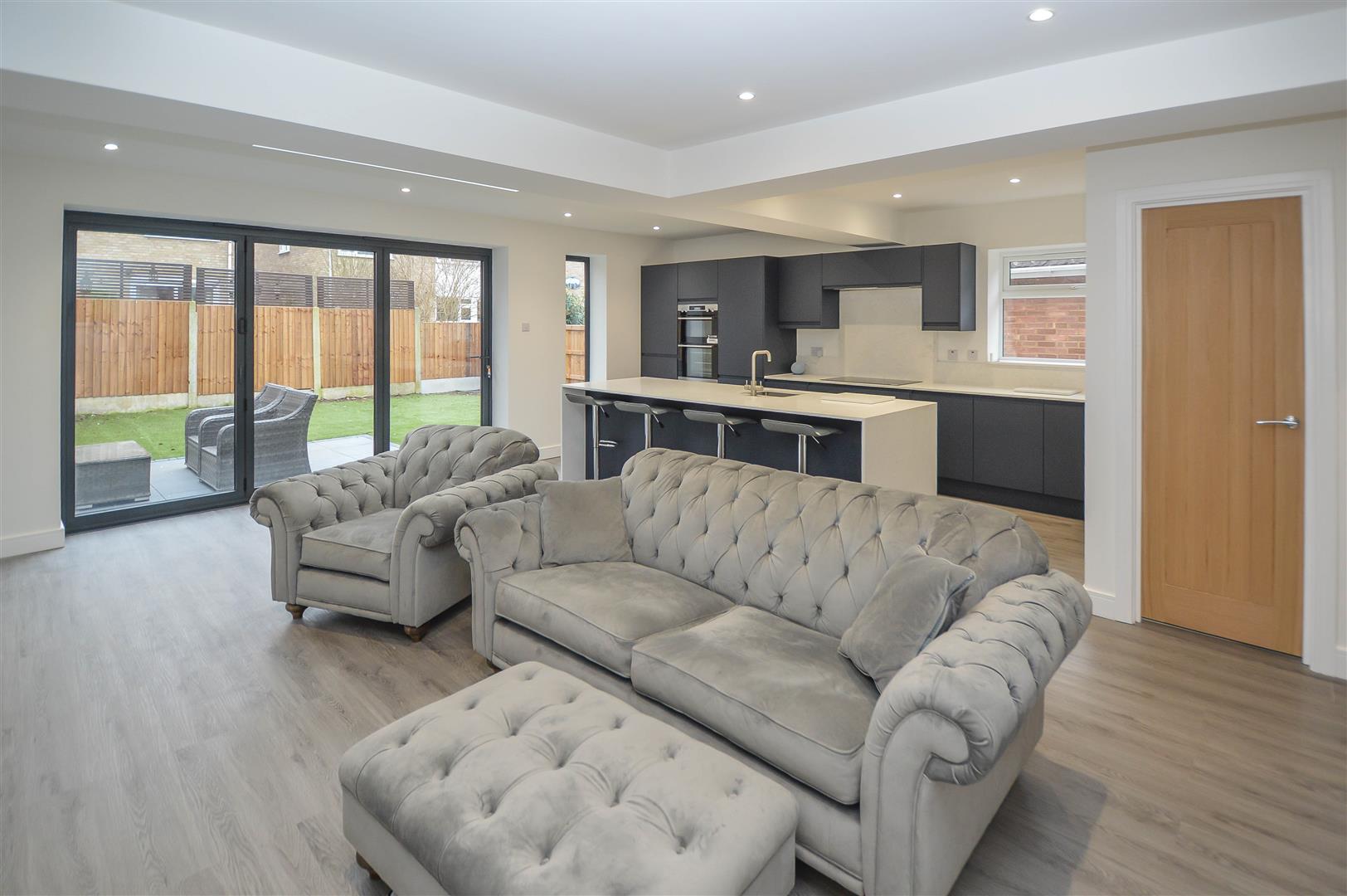 The property boasts a thoughtfully designed layout, beginning with a welcoming entrance hall that leads into a stunning open-plan lounge and kitchen area. This bright, contemporary space is enhanced by bi-fold doors opening to the rear garden and a ceiling lantern that bathes the room in natural light. The stylish kitchen is equipped with sleek units, granite worktops, integrated appliances, and a breakfast bar, making it a perfect setting for entertaining.