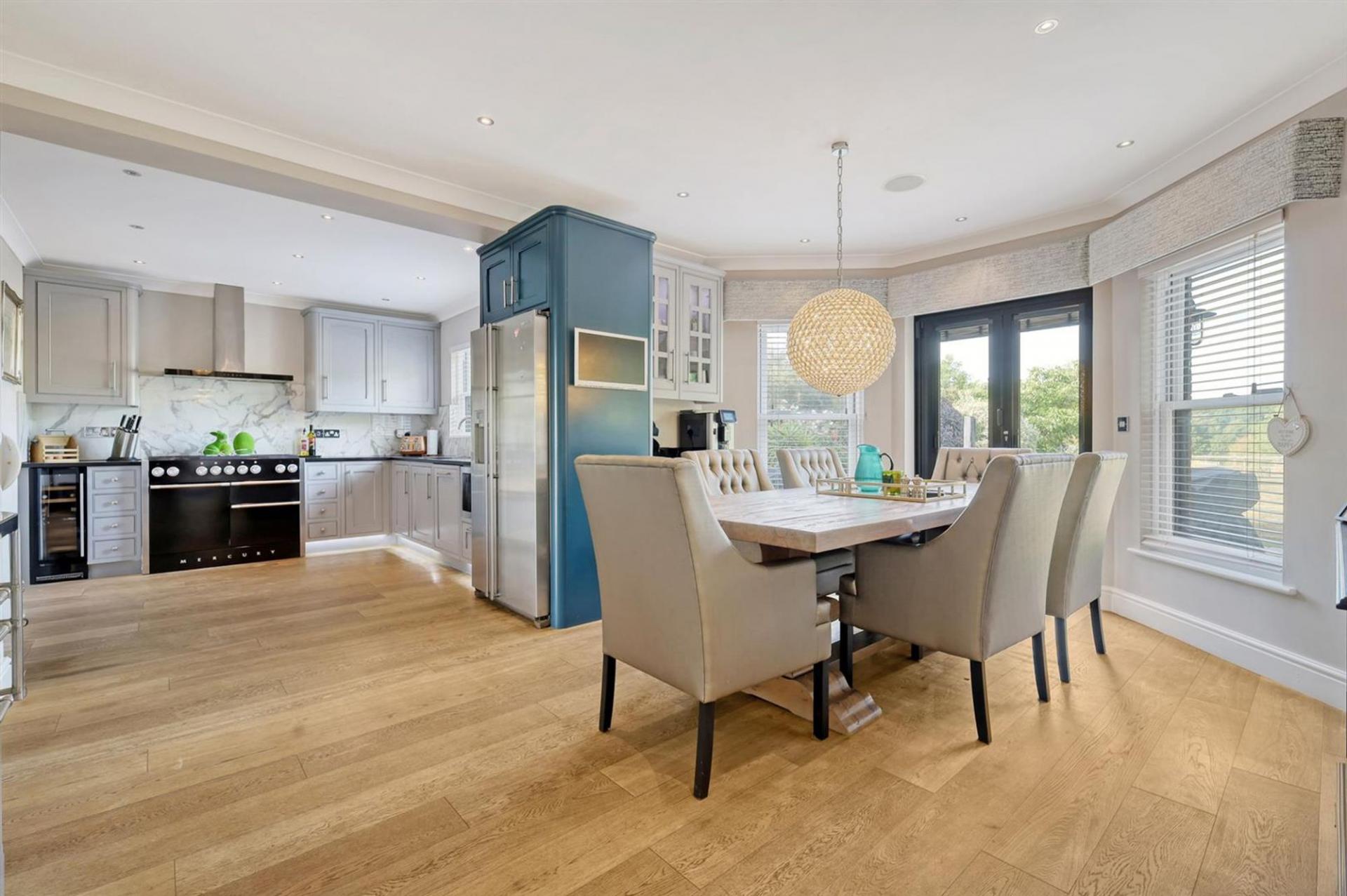 The inviting entrance hall creates an immediate sense of space and leads into three versatile reception rooms. The dual-aspect living room is a wonderful centrepiece, filled with natural light from its wide windows and French doors opening onto the garden, and centred around a stylish fireplace. A separate formal dining room provides the perfect setting for entertaining, while a further reception room serves equally well as a playroom or study.