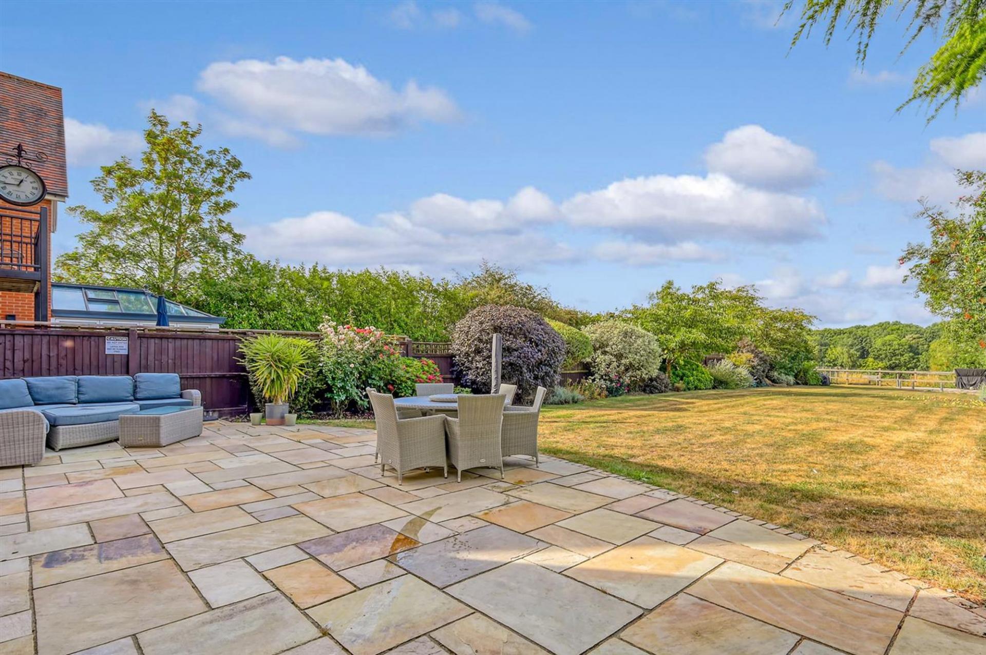 Outside, the property is complemented by a landscaped and enclosed rear garden. A broad patio terrace provides the perfect setting for summer dining and entertaining, with steps leading up to a neat lawn bordered by well-kept planting. To the front, a detached double garage offers secure parking and additional storage, with driveway space for multiple vehicles.
