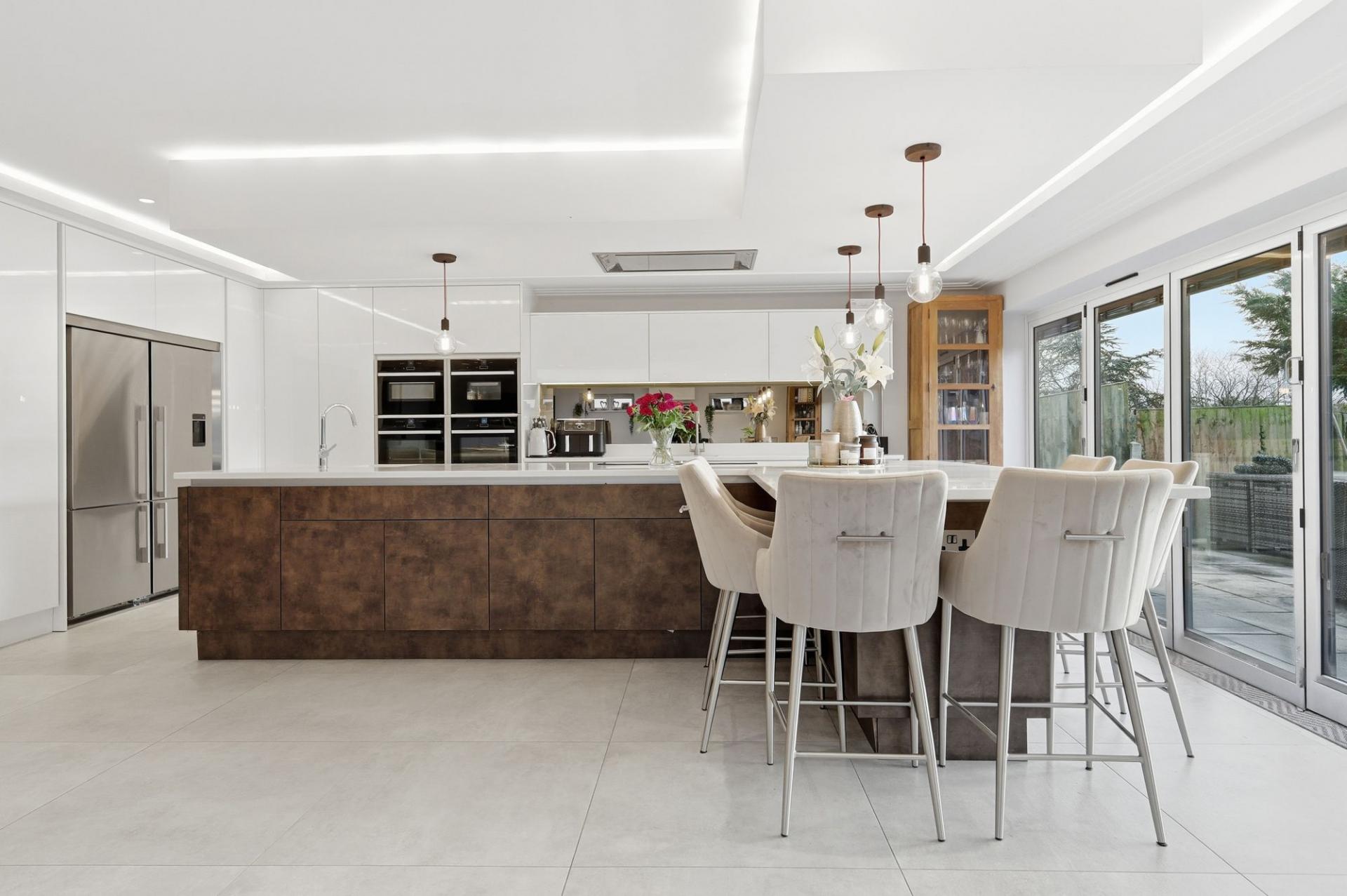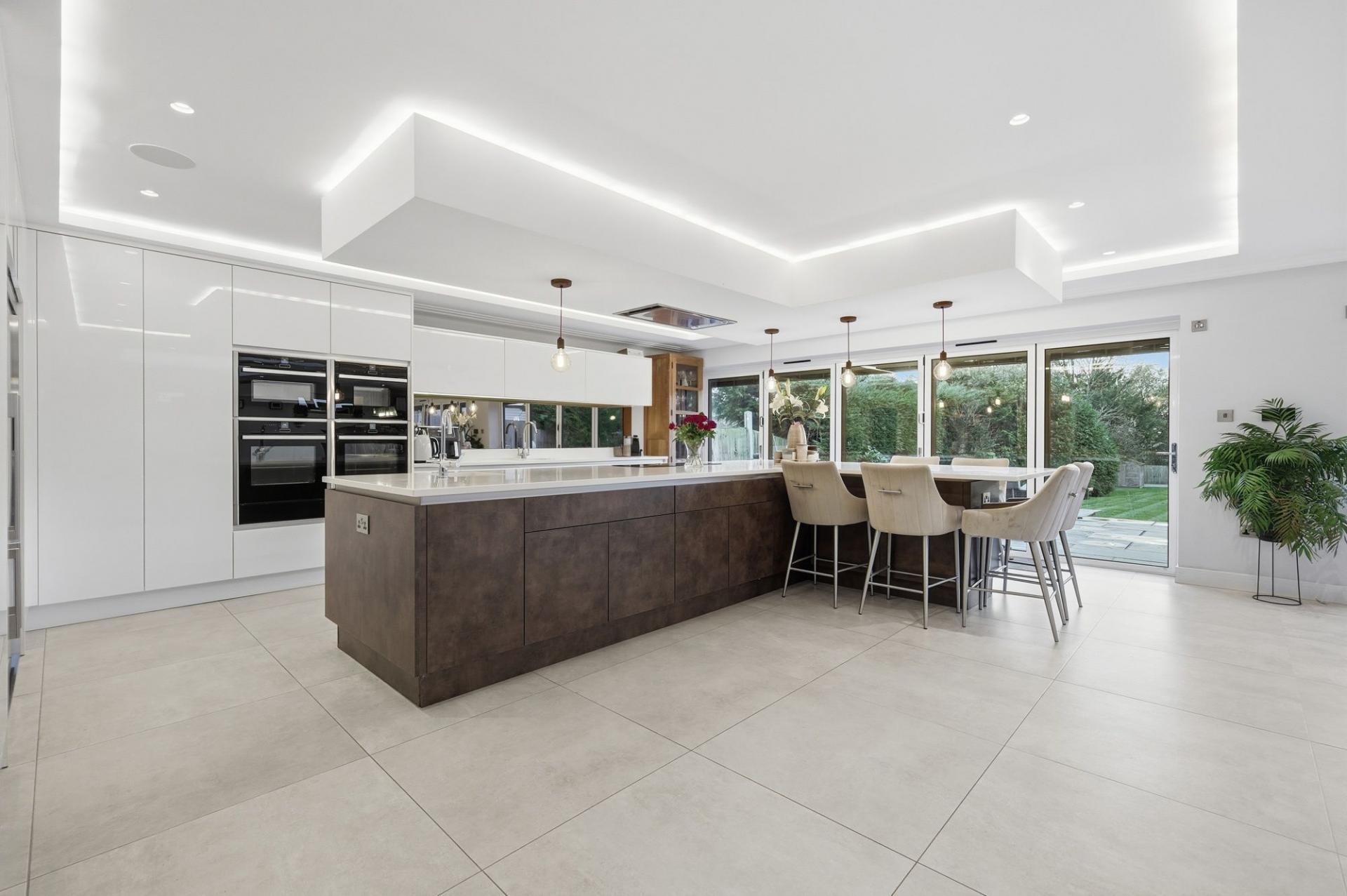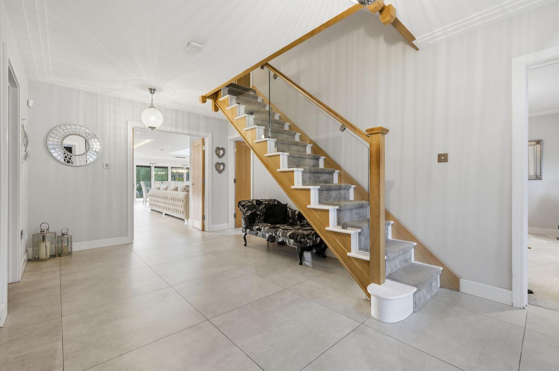 The accommodation is arranged over three spacious floors and showcases a stunning interior throughout. A grand entrance hall, with underfloor heating leads to three versatile reception rooms, including a snug, games room and a study, perfect for those working from home. The showpiece of the property is the outstanding open-plan kitchen/dining/living space, finished to an exceptional standard with modern high-gloss cabinetry, quartz worktops, a large central island and bi-folding doors that open onto the extensive rear garden, creating a bright and inviting family hub. A separate utility room offers further practicality.