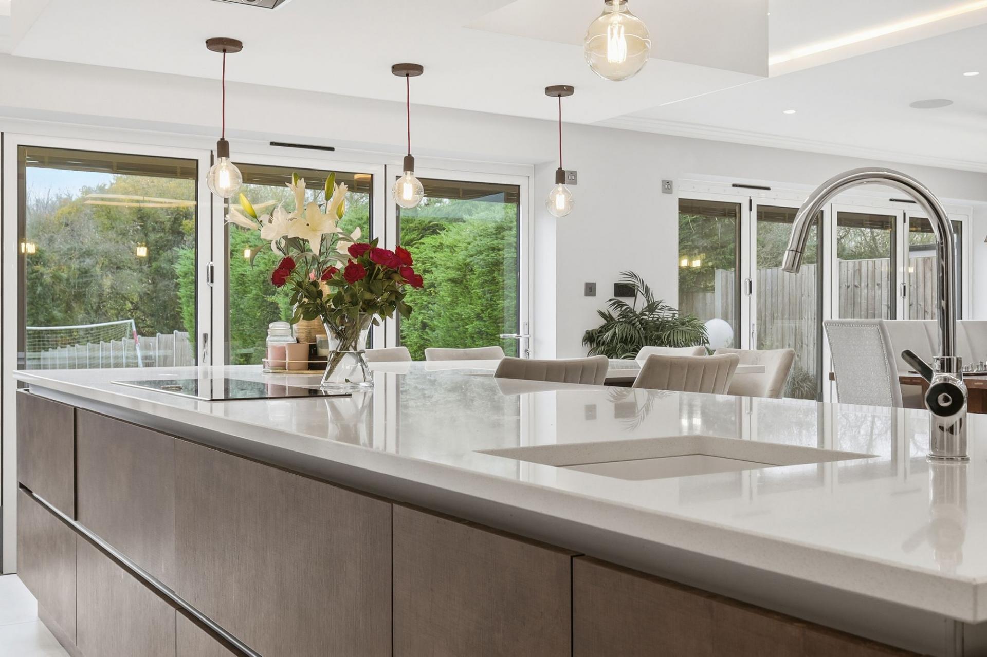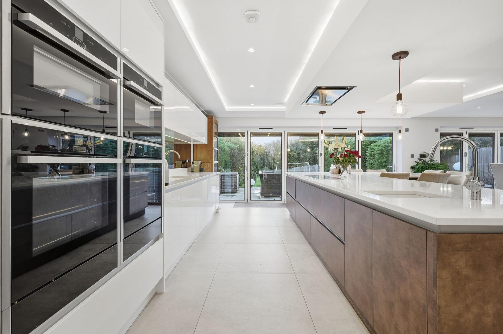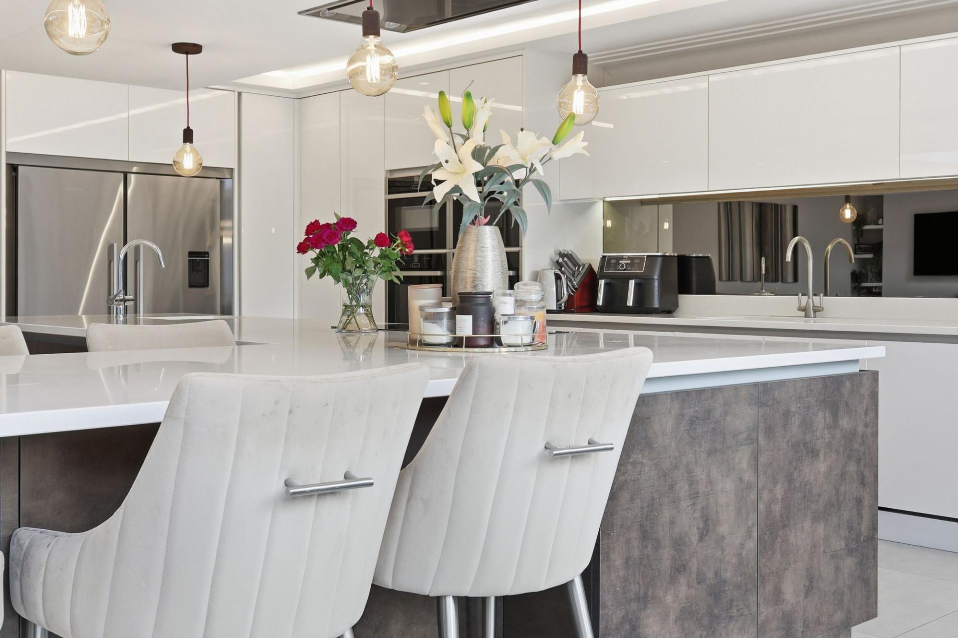 The accommodation is arranged over three spacious floors and showcases a stunning interior throughout. A grand entrance hall, with underfloor heating leads to three versatile reception rooms, including a snug, games room and a study, perfect for those working from home. The showpiece of the property is the outstanding open-plan kitchen/dining/living space, finished to an exceptional standard with modern high-gloss cabinetry, quartz worktops, a large central island and bi-folding doors that open onto the extensive rear garden, creating a bright and inviting family hub. A separate utility room offers further practicality.