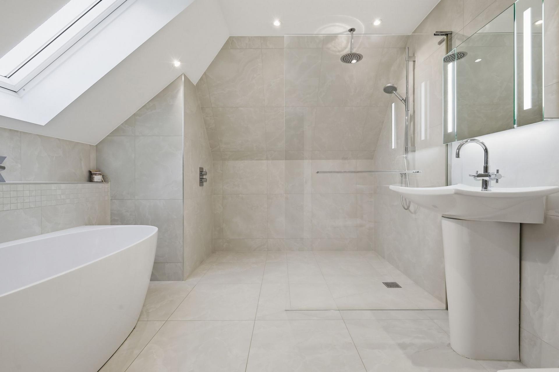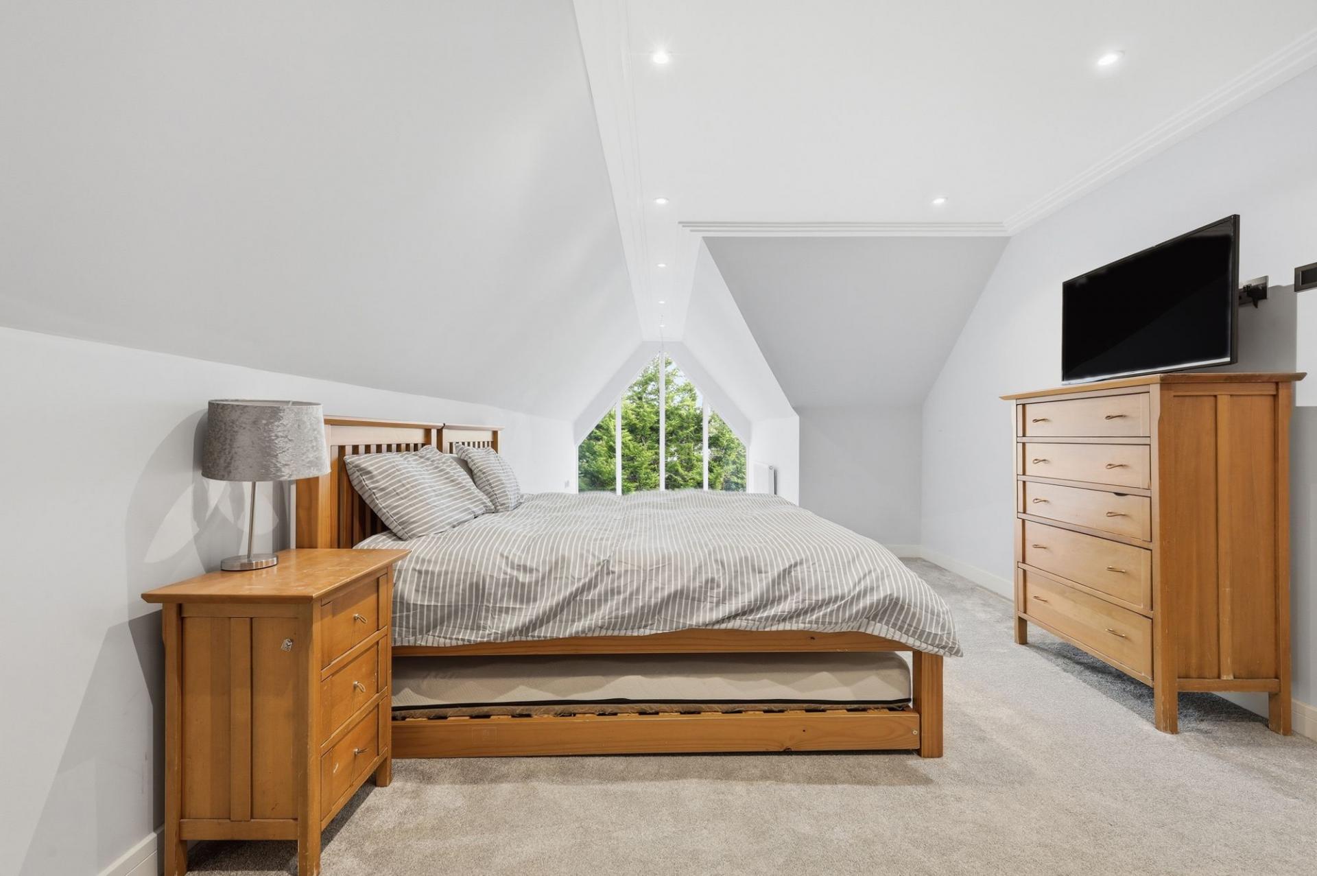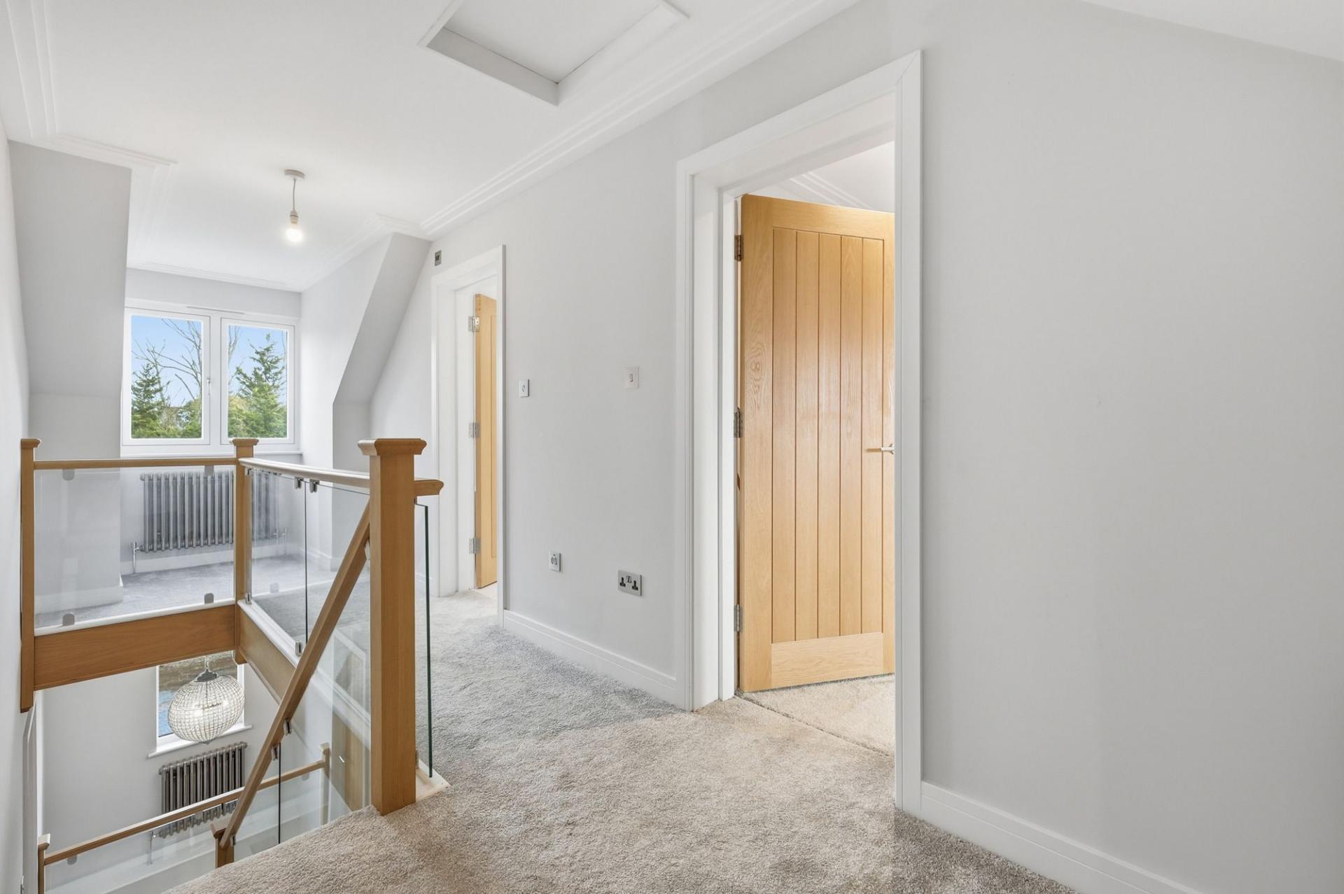 The elegant oak staircase ascends to a galleried first-floor landing where four generous double bedrooms await, each served by luxuriously appointed bathrooms. Three of the bedrooms also benefit from their own dressing rooms, offering abundant storage and privacy. The top floor hosts two additional double bedrooms and a further well-appointed bathroom, providing excellent flexibility for larger families or guests.
