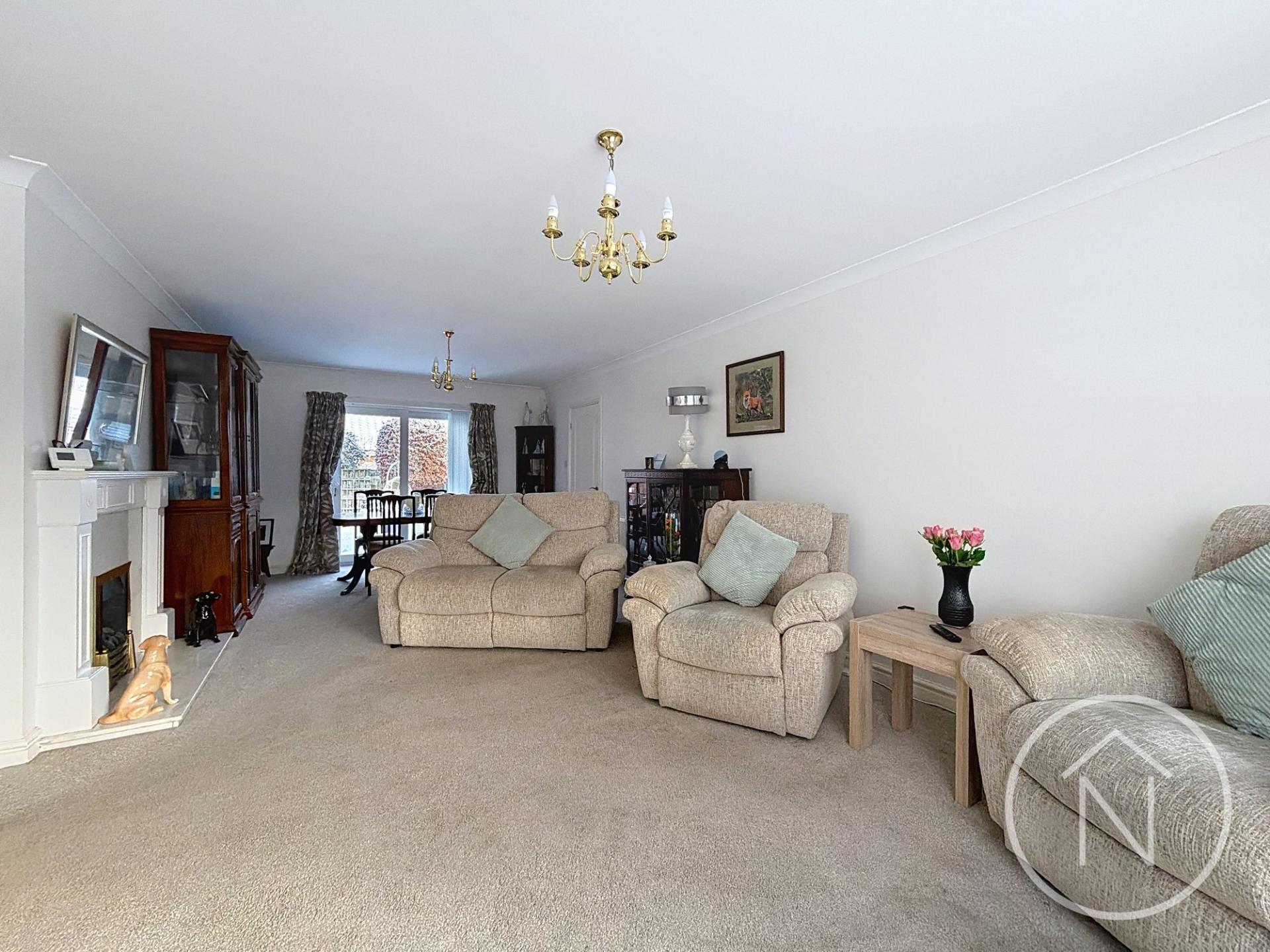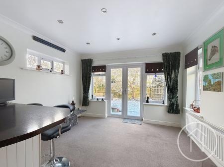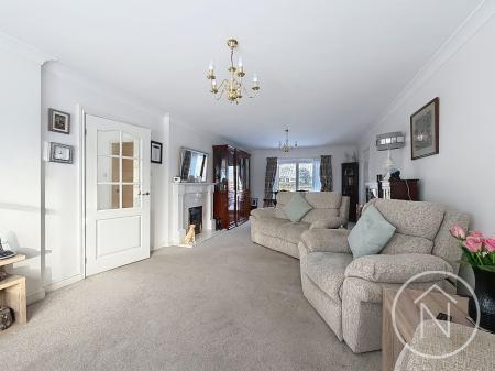 This beautifully presented detached bungalow offers spacious and versatile accommodation, thoughtfully designed for modern living. Boasting three generously sized bedrooms, the property impresses with its light-filled open plan living and dining areas, enhanced by expansive windows that flood the rooms with natural light. The main living spaces feature cosy fireplaces, creating an inviting atmosphere ideal for both relaxation and entertaining. A fully integrated kitchen is complemented by sleek units, ample countertop space, a tiled backsplash, and a convenient breakfast bar, with seamless flow into the dining space. French doors and large sliding doors provide effortless access to the beautiful garden, promoting a sense of indoor-outdoor living.