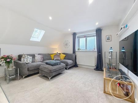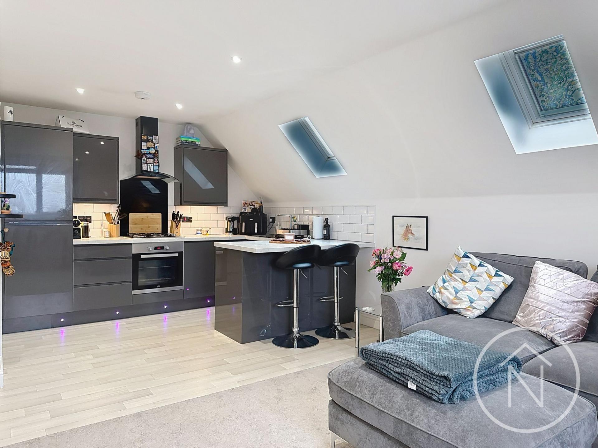 This exceptional two-bedroom apartment impresses from the outset. A bright and spacious open plan living area forms the heart of the home, benefitting from an abundance of natural light thanks to several skylights and Velux windows. The living space is thoughtfully designed with a large L-shaped sofa, tastefully neutral decor, and a wall-mounted TV, creating a warm and welcoming atmosphere for both relaxation and entertaining guests.