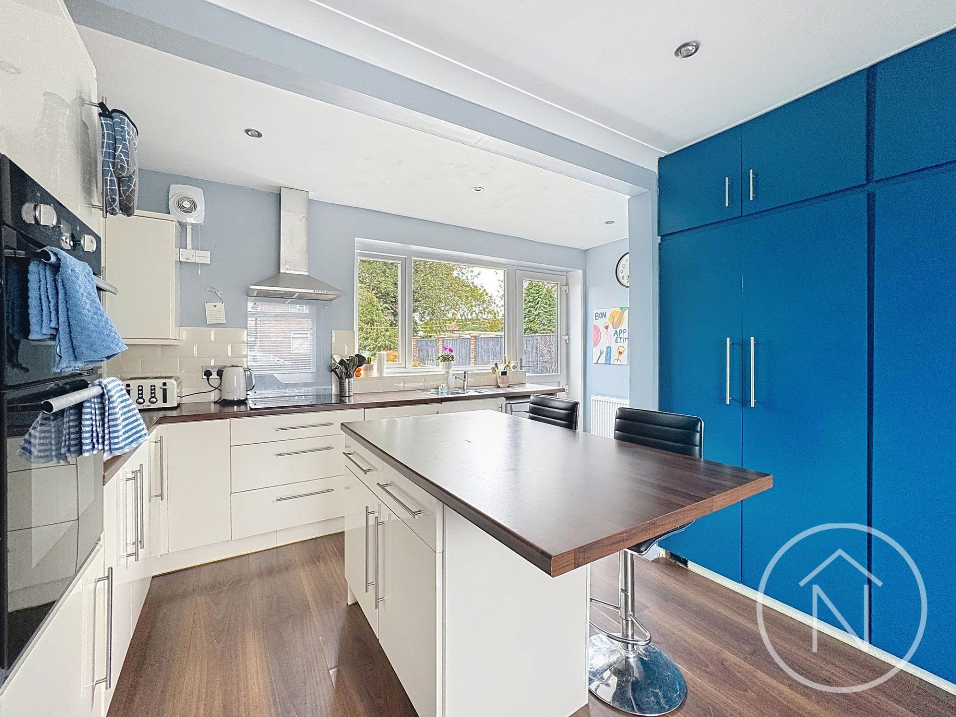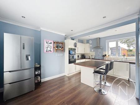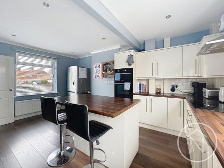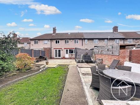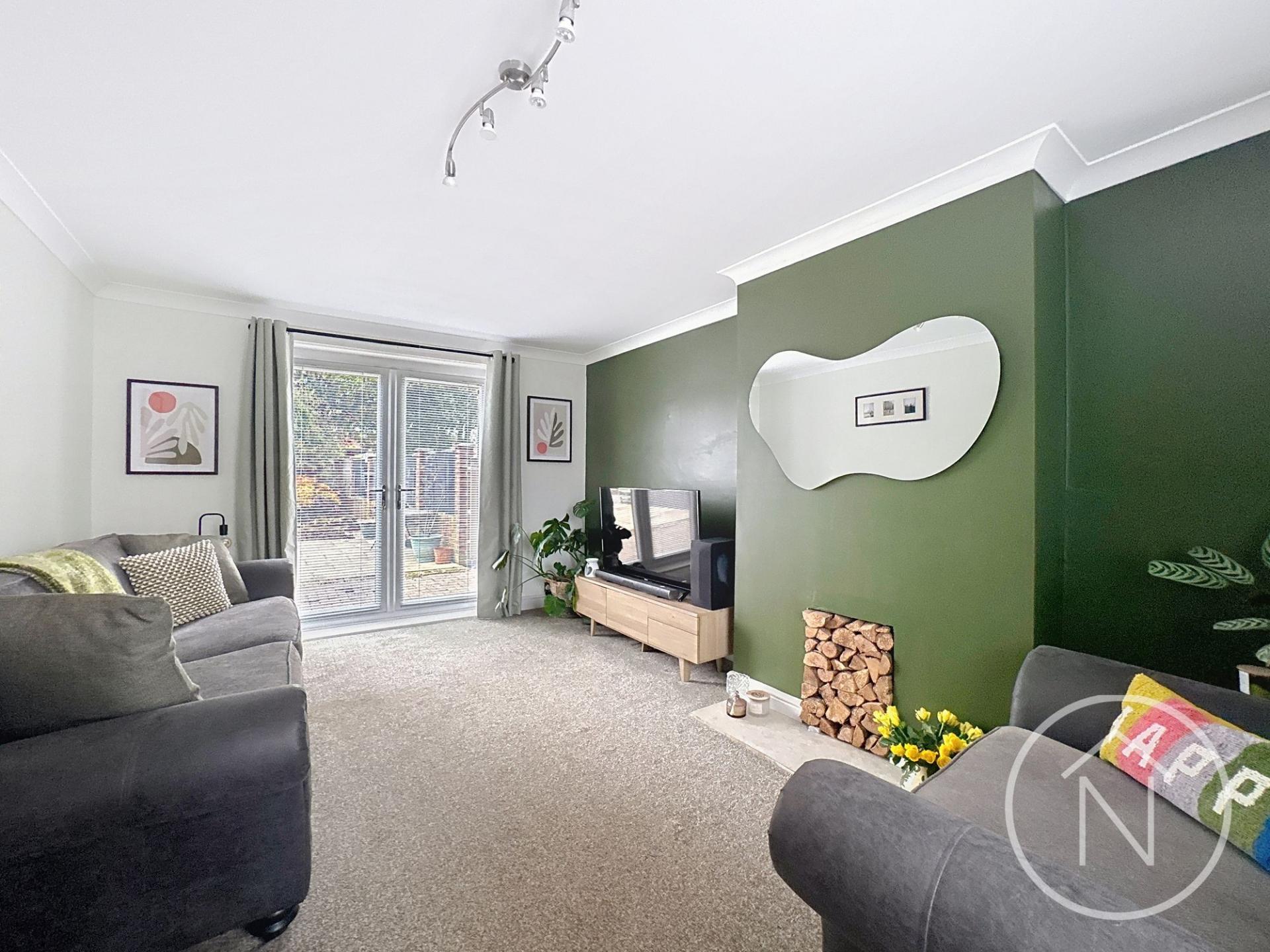 This beautifully presented three-bedroom, one-bathroom terraced house offers contemporary living at its finest. The heart of the home is a modern kitchen featuring sleek cabinetry, integrated appliances, and a central island with bar seating - perfect for both casual dining and entertaining guests. The spacious reception room is enhanced by a striking feature wall and enjoys abundant natural light, creating a welcoming space for relaxation. French doors lead directly from the living area to the garden, offering seamless indoor-outdoor living and extending the entertaining space outdoors.