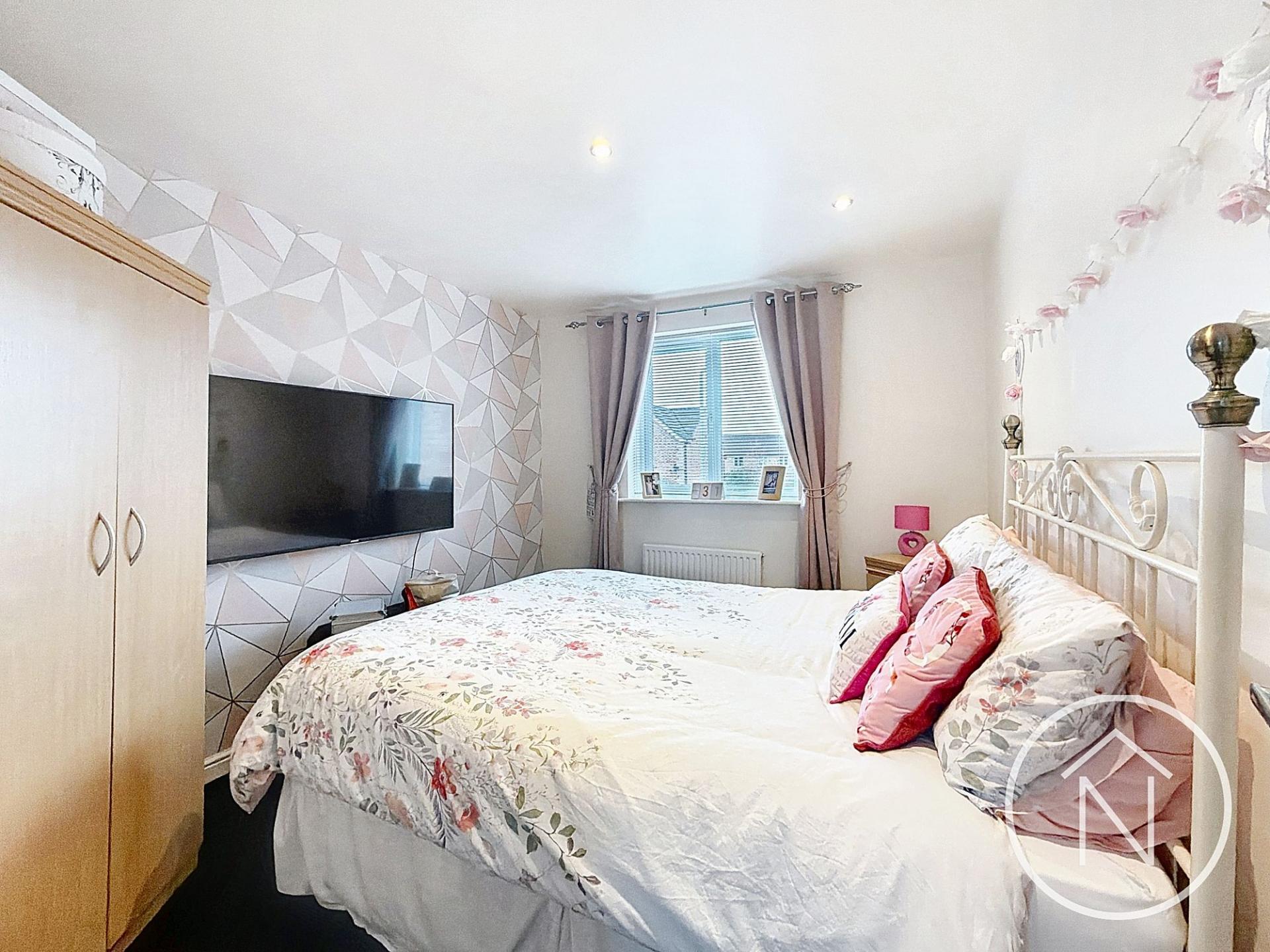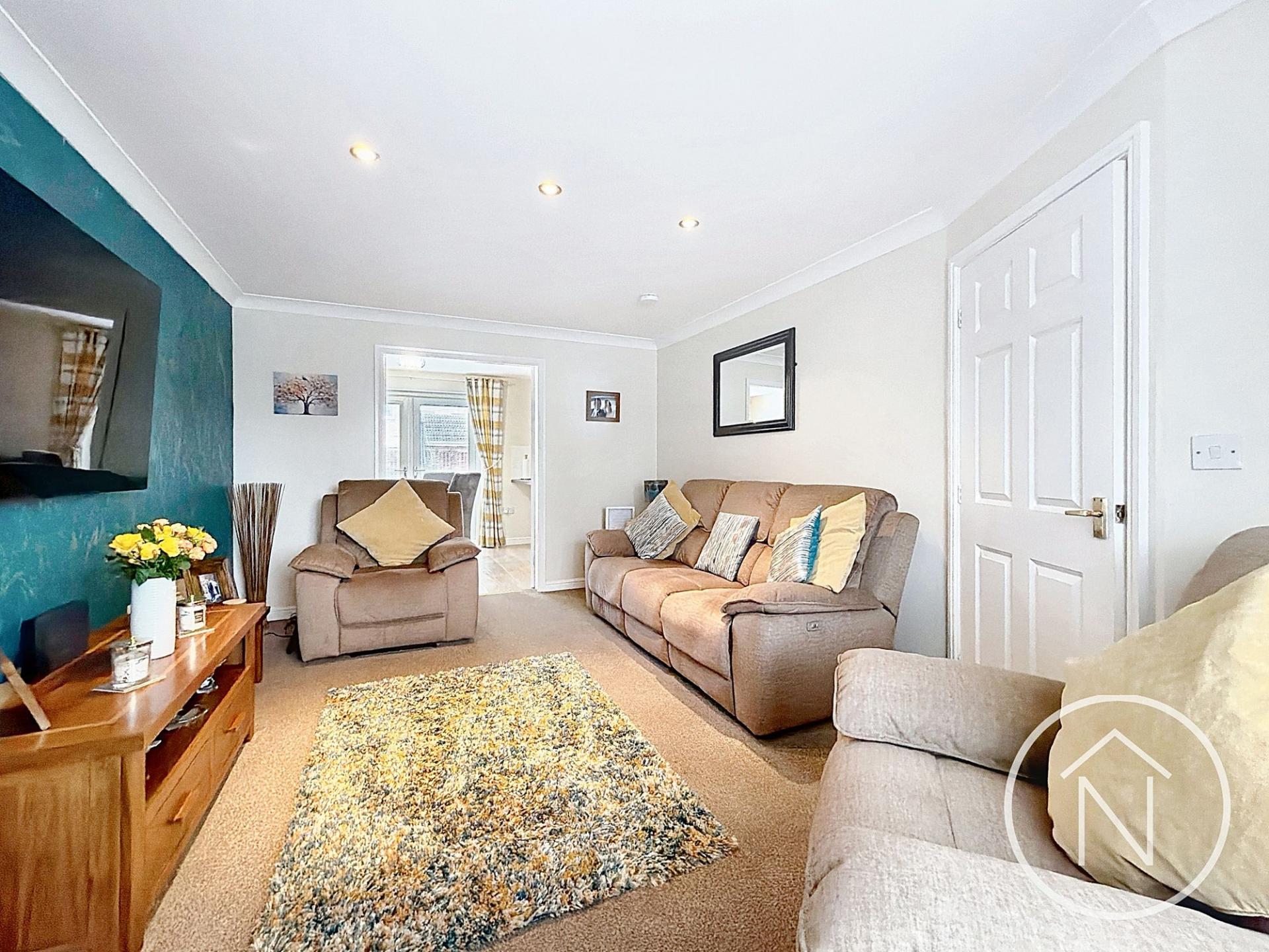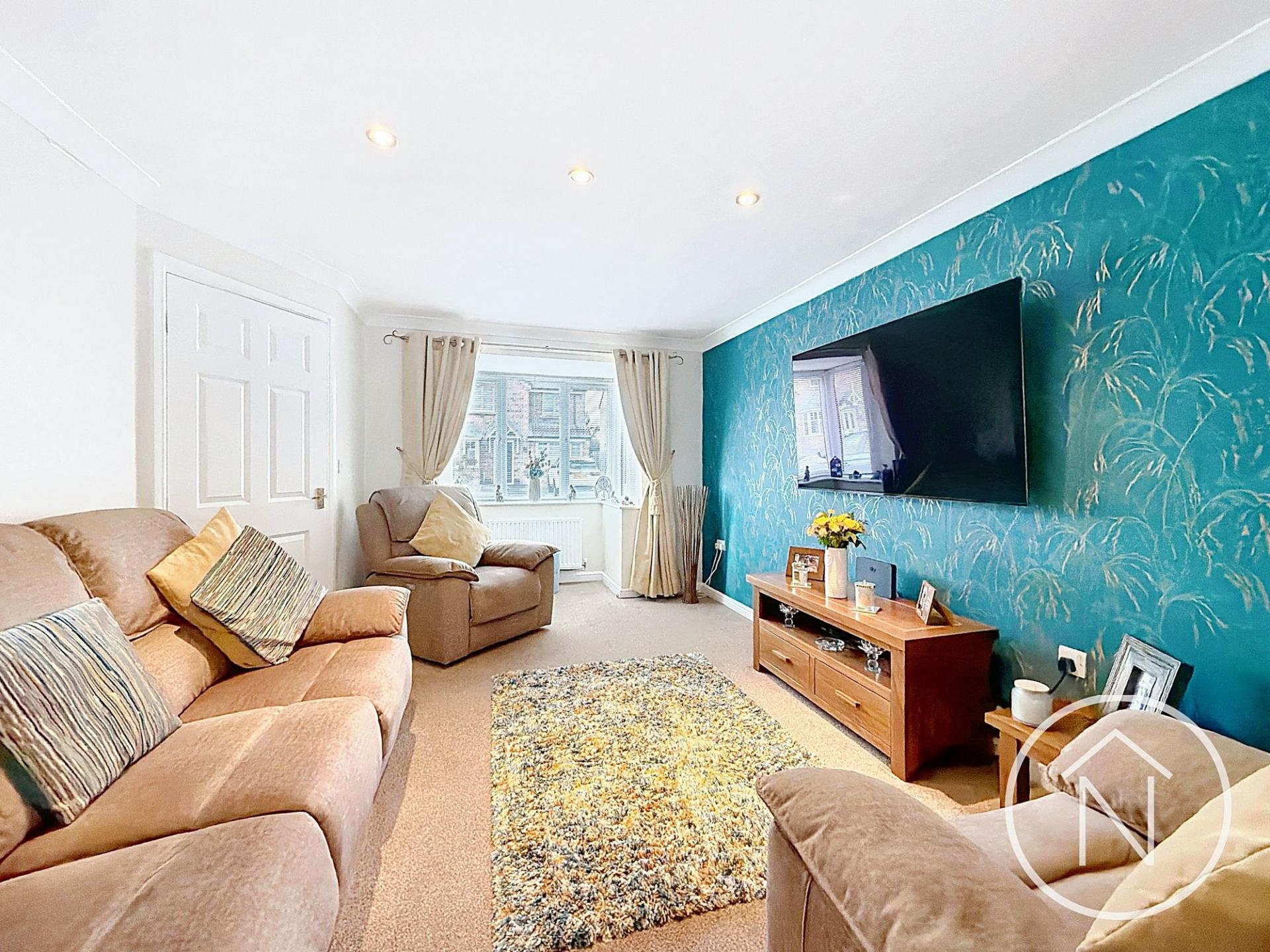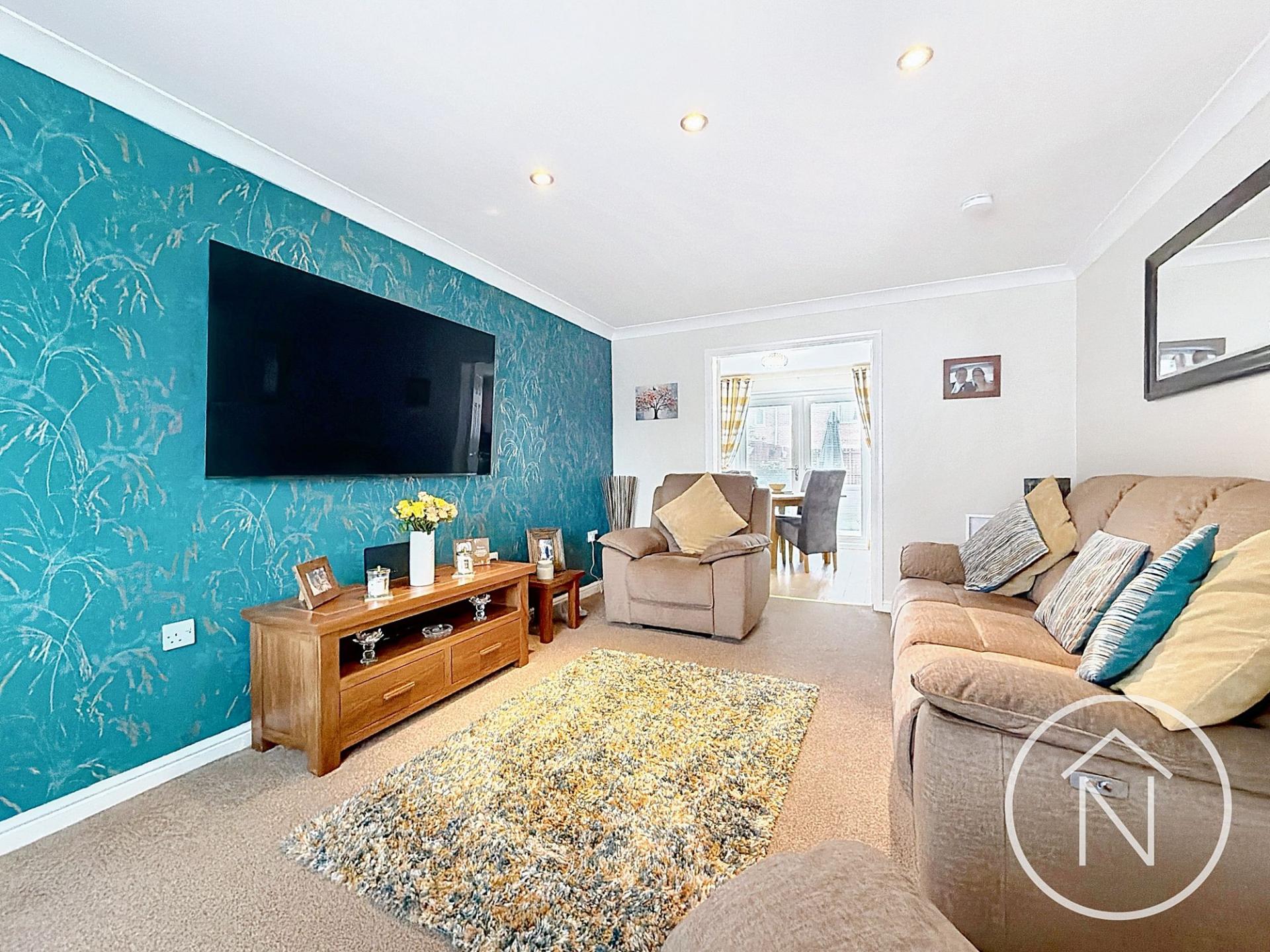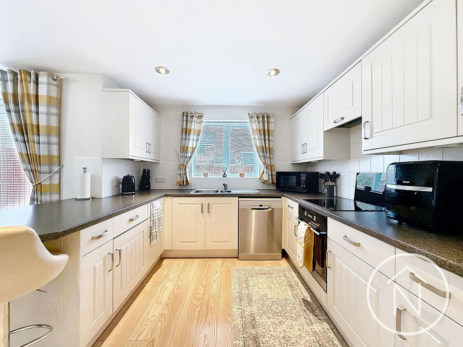 This impressive four-bedroom, three-bathroom detached house offers contemporary living in a beautifully presented setting. The heart of the home is the open plan kitchen and dining area, featuring sleek modern units, integrated appliances, and a breakfast bar - perfect for family meals and entertaining guests. French doors provide seamless access to the spacious garden and patio, creating an ideal space for indoor-outdoor living. The inviting living room is enhanced by a large bay window, striking accent wall, recessed lighting, and plush carpet, delivering both comfort and style. Each bedroom benefits from abundant natural light. The principal bedroom enjoys a modern en-suite bathroom, while additional bedrooms offer versatility for family or home office use.