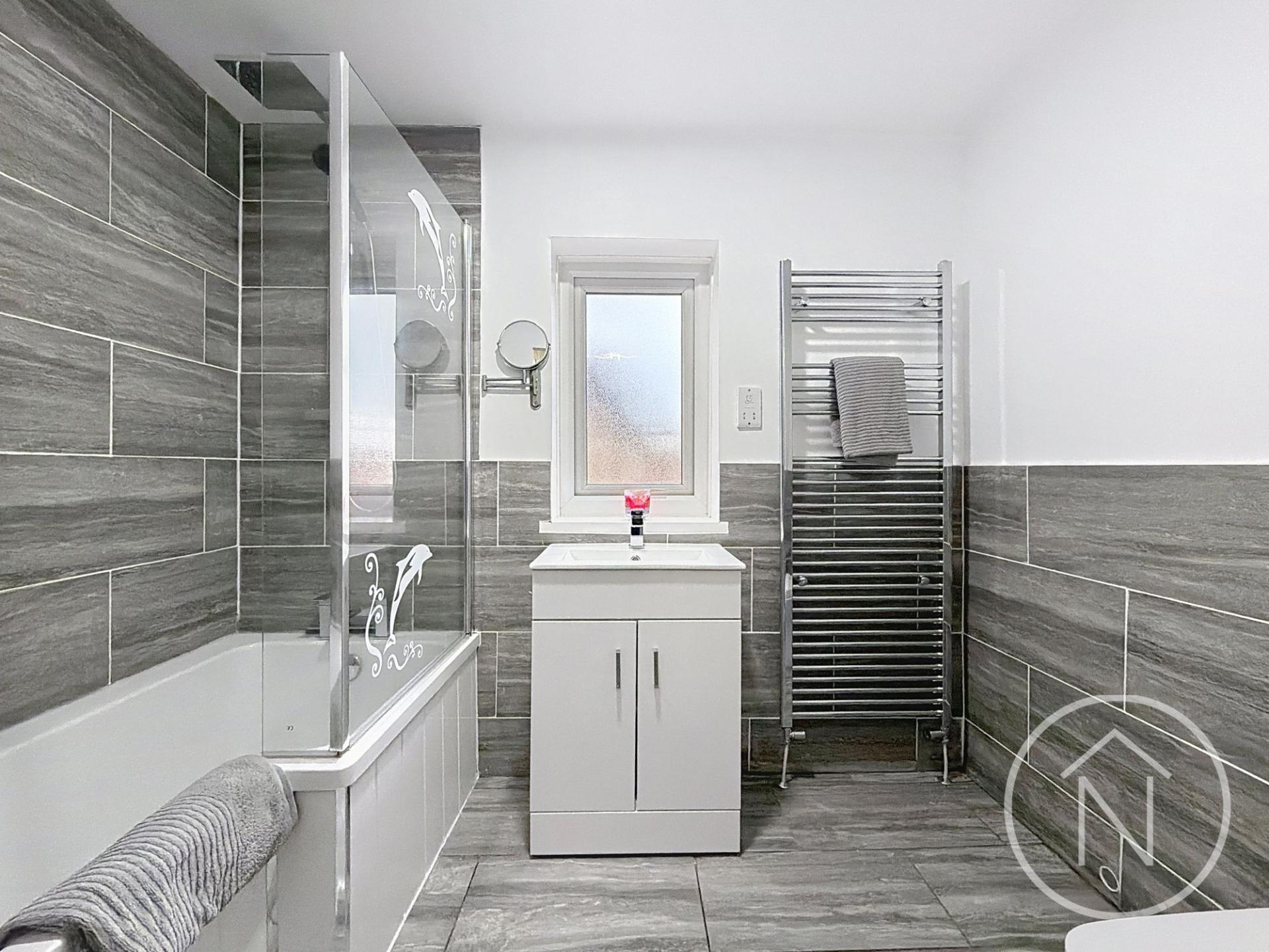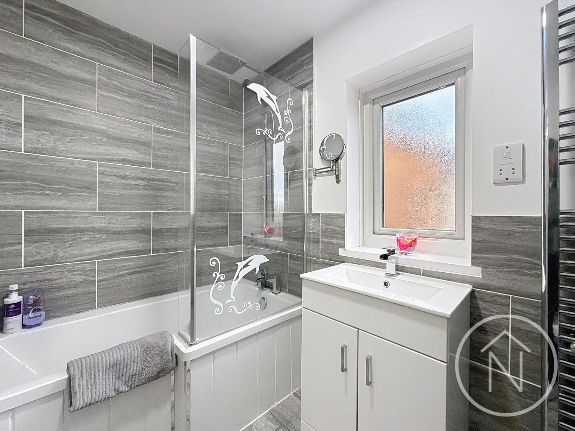 Additional benefits include a stylish modern bathroom with elegant tiling, a bath with shower over, and a heated towel rail for added comfort. The bedrooms are well-proportioned, providing inviting retreats. Outside, the property boasts a low-maintenance garden featuring artificial grass, a paved patio area for outdoor entertaining, and secure wooden fencing for privacy. Off-road parking is available via a spacious driveway, complemented by a well-maintained front lawn that enhances the property’s kerb appeal. This home is perfect for first time buyers and families.