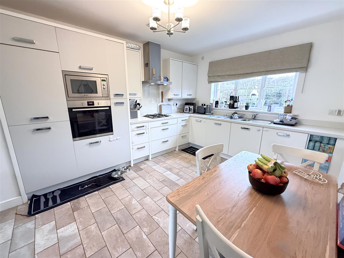 Dining Kitchen - 4.17m x 3.43m (13'8" x 11'3") - A well proportioned space with a southerly aspect into the rear garden and being large enough to accommodate a small dining or breakfast table, having continuation of the tiled floor and a door returning to the main entrance hall. The kitchen area is fitted with a range of wall, base and drawer units including a 3/4 high larder unit which incorporates a pull out cupboard; integrated appliances include fridge, freezer, single oven, microwave, Smeg four ring gas hob with chimney hood over and dishwasher; an L shaped configuration of laminate work surfaces having inset sink and drain unit with chrome mixer tap; and a further door leading through into:
