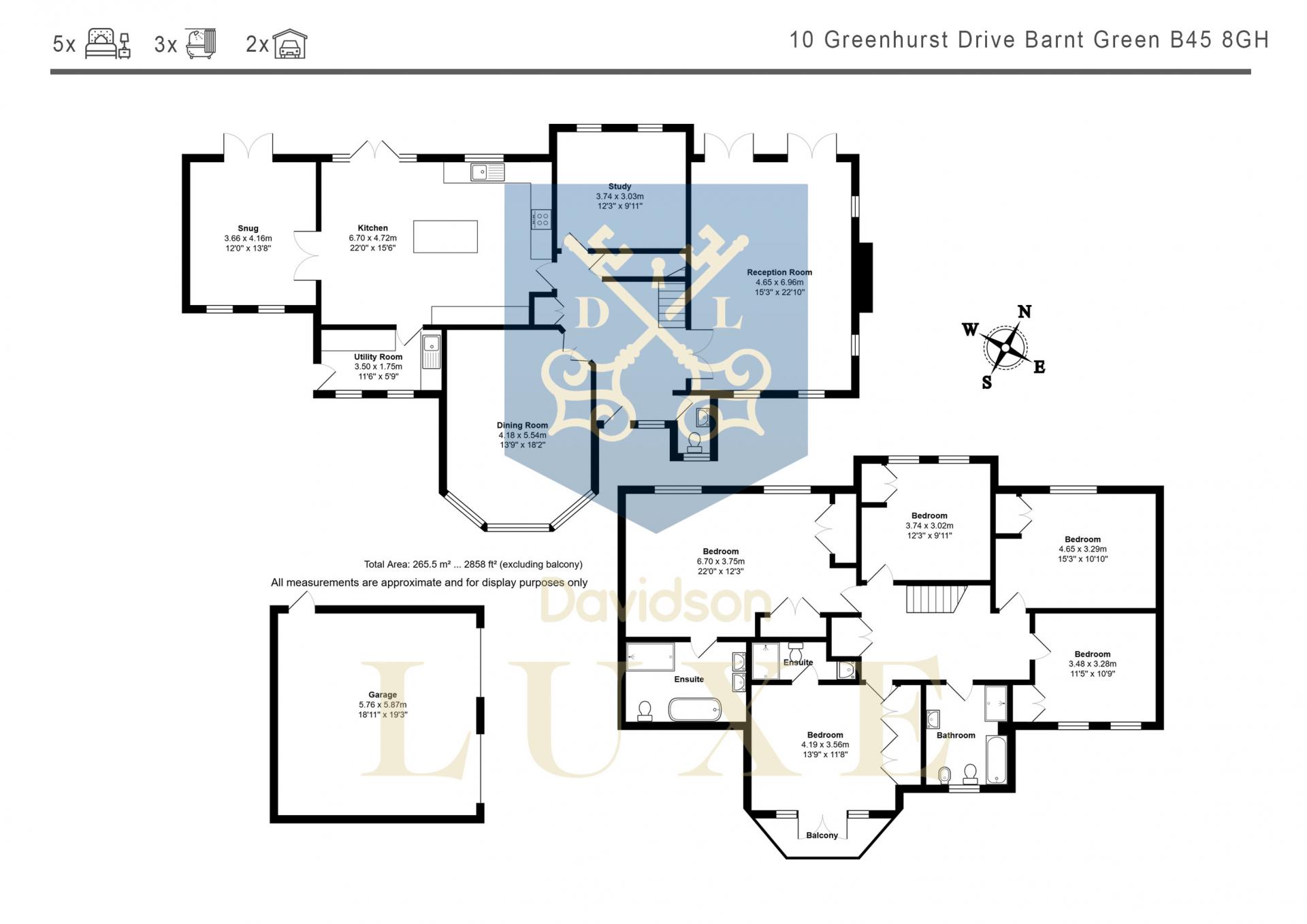 Upstairs, the property features five well-proportioned bedrooms, including a superb principal bedroom with en-suite shower room and balcony, a second double bedroom also benefits from en-suit facilities. The remaining bedrooms are served by a modern family bathroom, finished to a high standard.