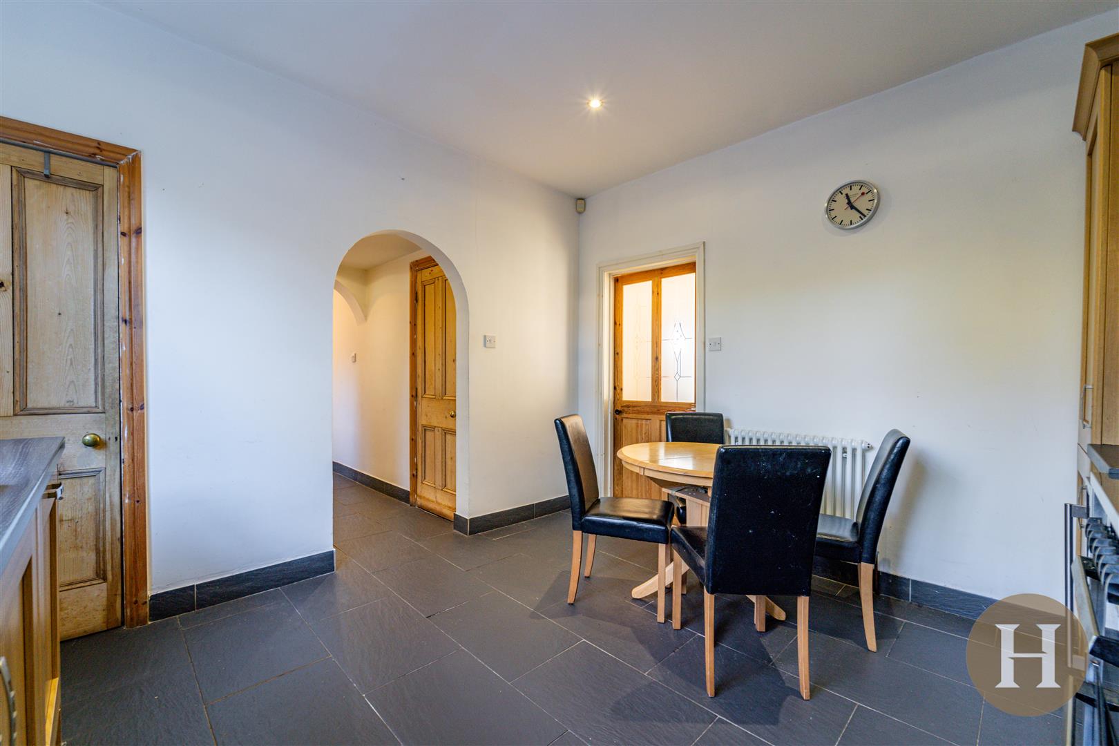 Dining Kitchen - 11'10" x 11'3" - Having a range of units to include sink unit with side drainer and base units beneath, further base and wall units, wine rack, integrated dishwasher, gas cooker point, floor and wall tiling, column radiator, low wattage halogen ceiling light point, ceiling light point, under floor heating, walk-in pantry housing a newly fitted 'Worcester' boiler, double glazed picture window to rear and archway through to: