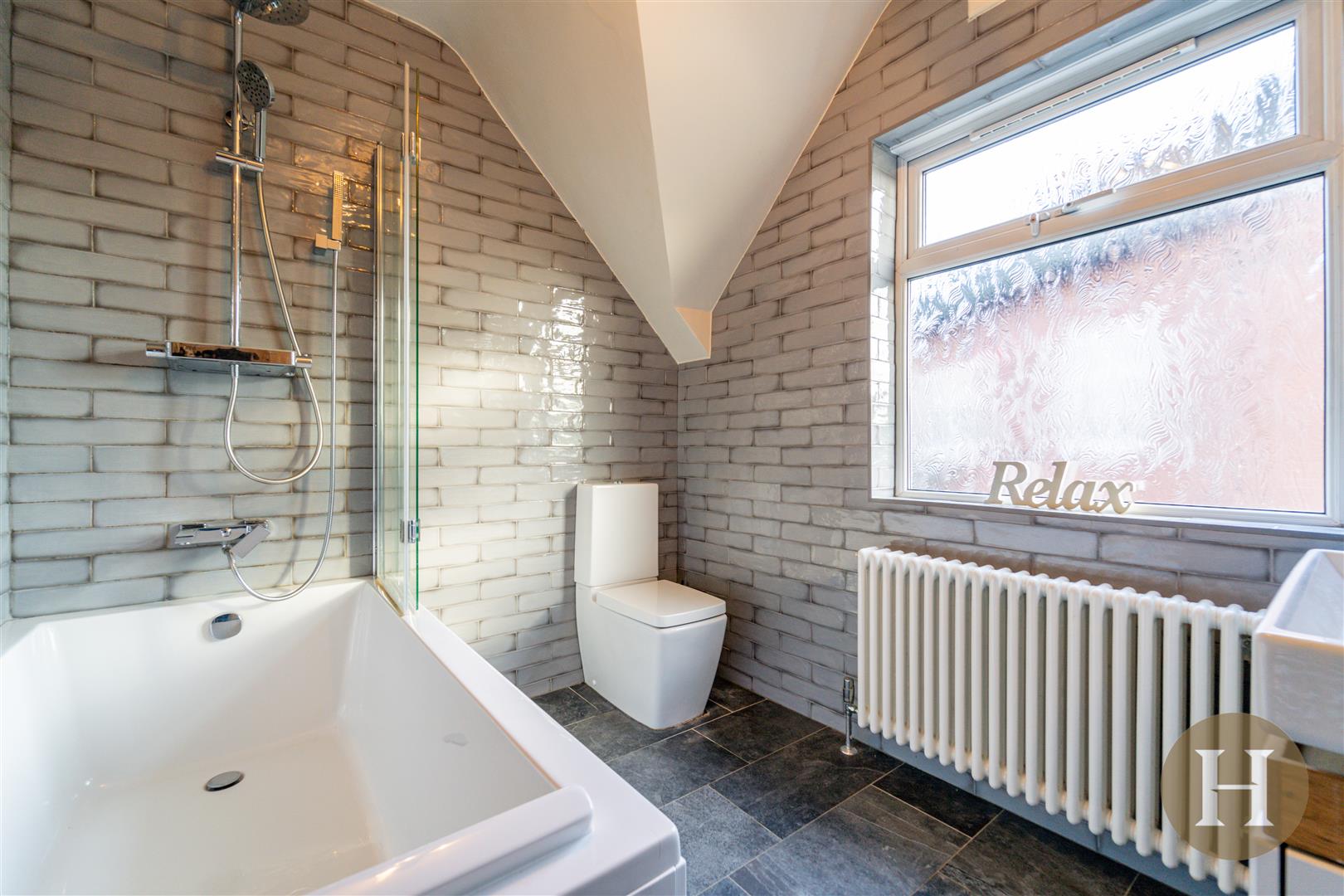 Bathroom - Comprising glazed tiling, panelled bath with on-line shower with rain head and body spray, low level WC, vanity wash hand basin, column radiator, opaque double glazed window to side.