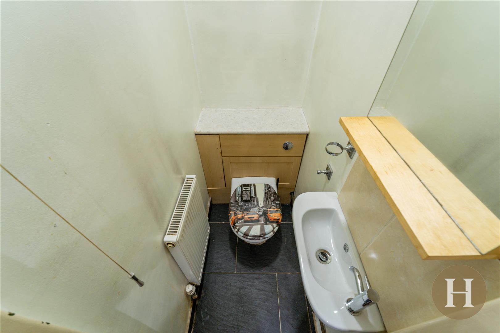Guest Cloakroom - Housing low level WC, wash hand basin, central heating radiator and ceiling light point.