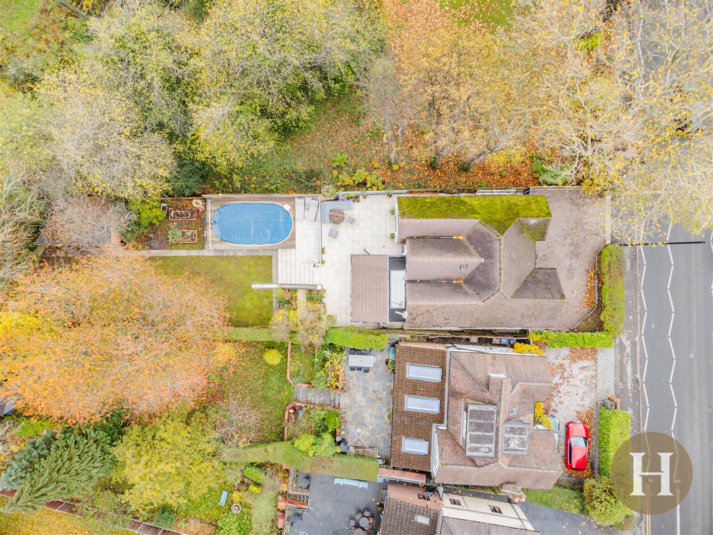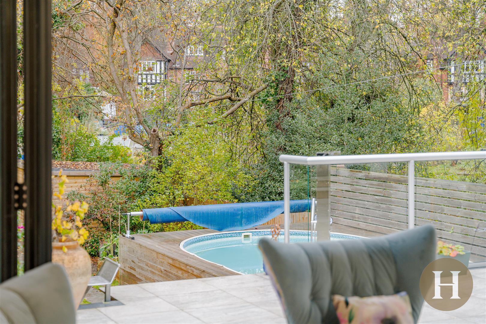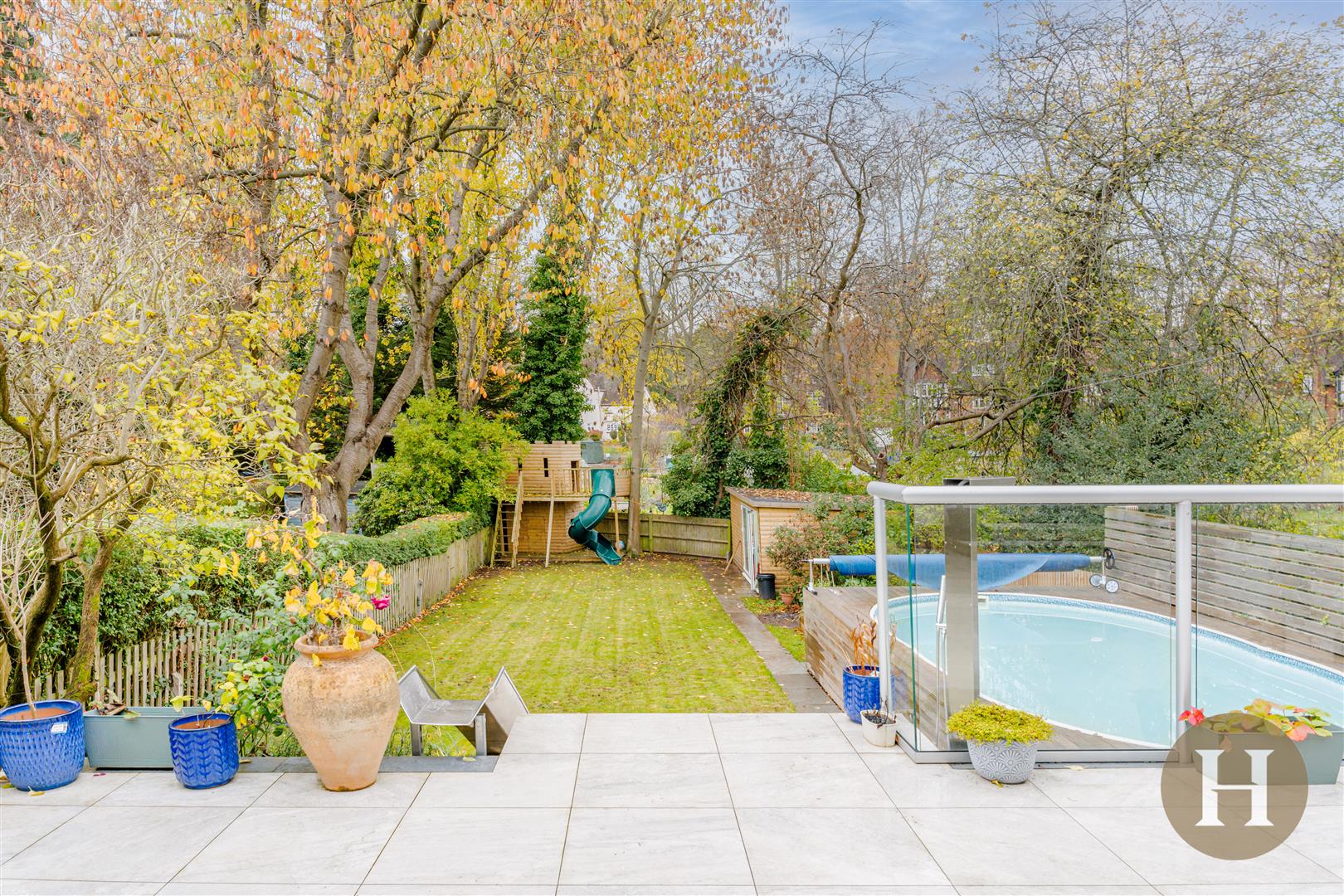 Garden - Extensive garden, laid to lawn and boasting significant patio area. Wrap around tiled patio, steps down to additional seating area and above ground pool. To the rear of the garden is an extensive garden room and storage area.