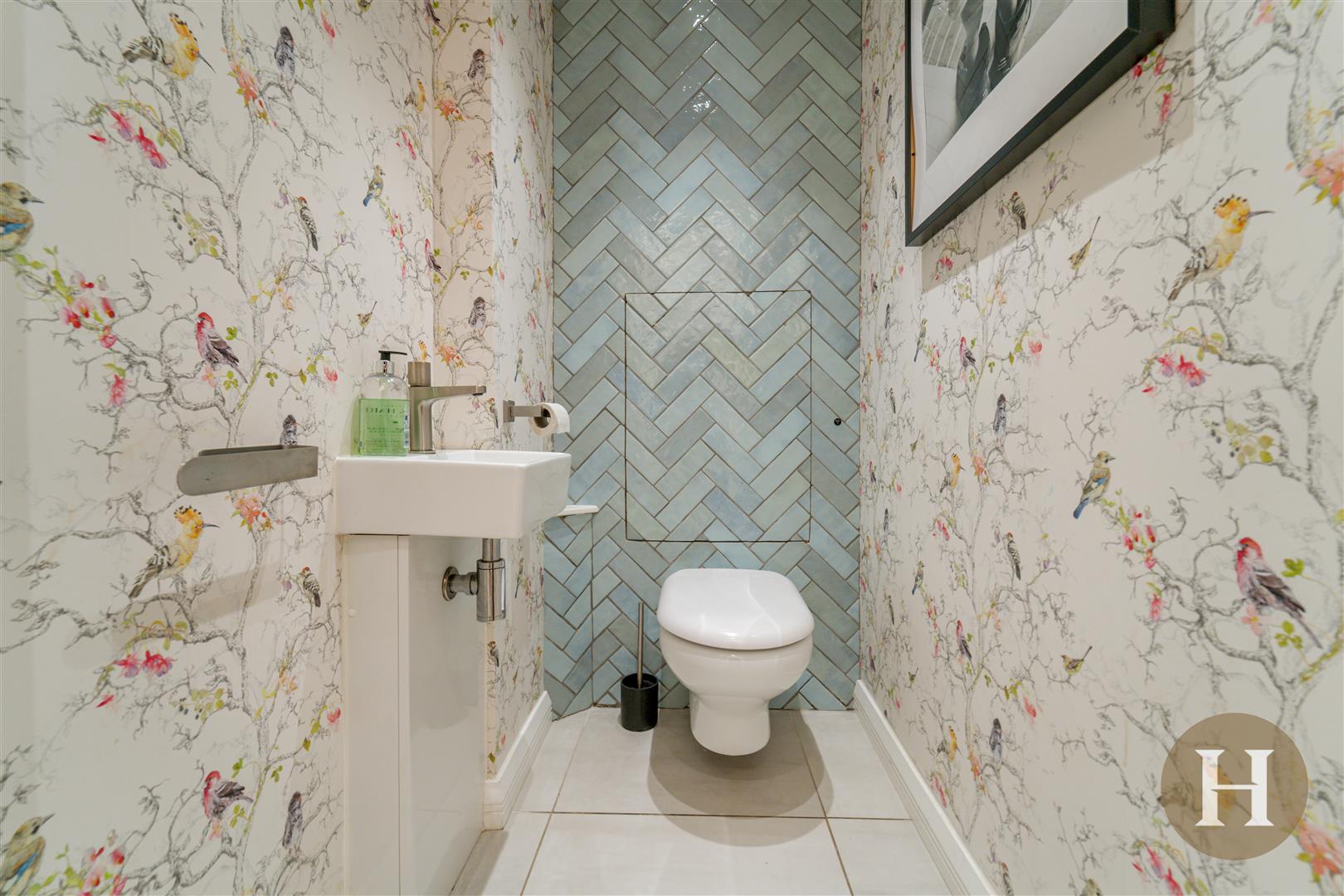 Guest Wc - Low level flush WC, hand wash basin, ceiling spotlights and underfloor heating.