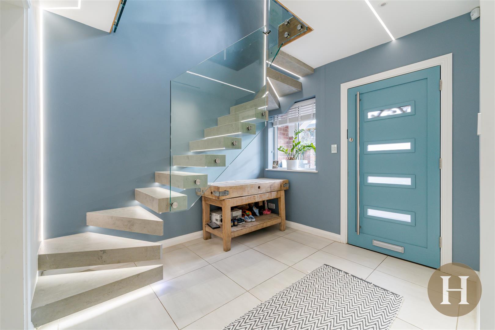 Entrance Hall - Floating staircase to first floor accommodation with down lighting, glass balustrade, LED lighting and tiled flooring. Underfloor heating, handmade front door and double glazed window to front elevation.