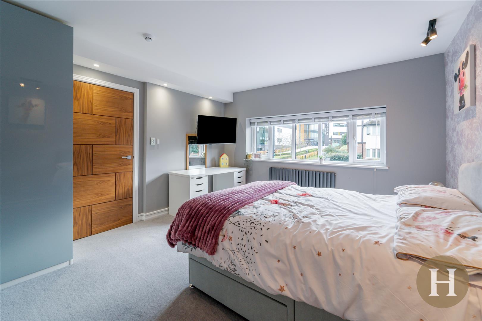 Master Bedroom - An extensive master suite, boasting three windows to the rear elevation, bi-fold Juliet balcony doors and tall ceiling. Fitted wardrobes, floating beside tables, wall and ceiling LED lighting and feature ceiling light point.