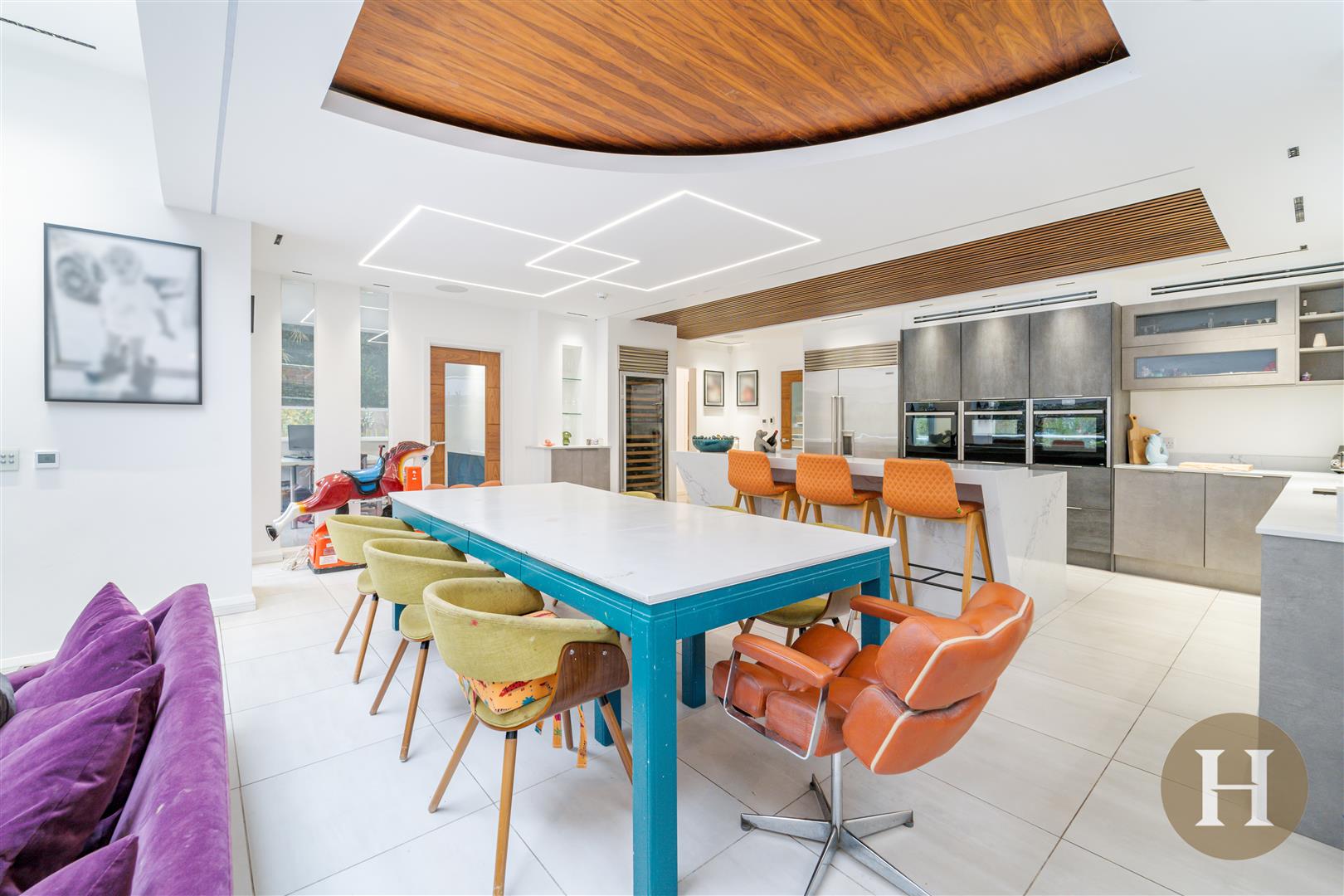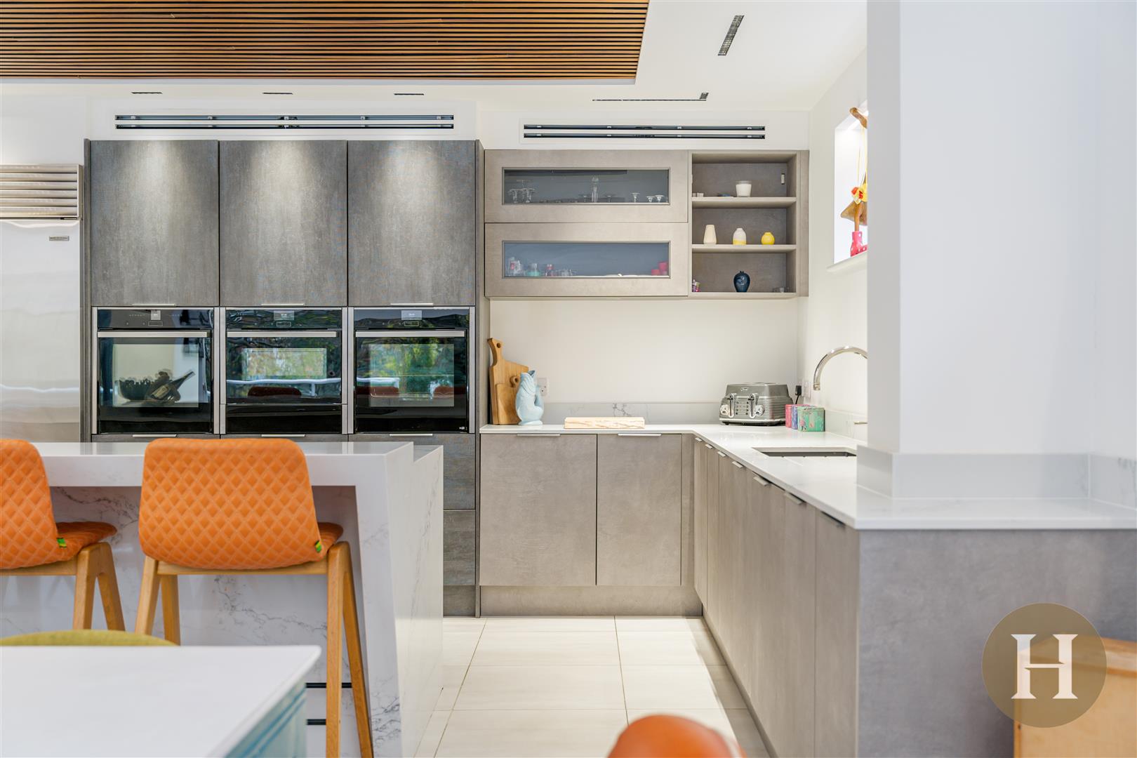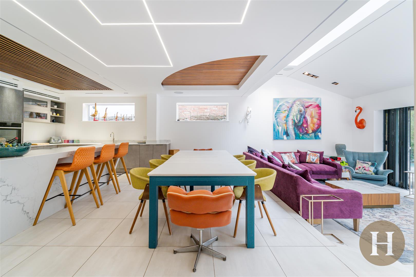 Kitchen Diner - Modern open plan kitchen diner, boasting a bespoke quartz island, complete with undercounter storage and breakfast bar. Feature LED lighting set within the designer ceiling, including sound system. Built in high end appliances, including wine fridge, fridge freezer and oven. Tiled flooring offering underfloor heating, integrated dishwasher and inset sink with boiling water tap.
