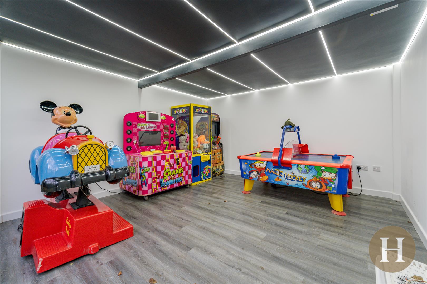 Utility Room - Plumbing for appliances, wall and ceiling LED lighting, a range of base and wall units. Towel radiator, sink and drainer unit along with tiled flooring.