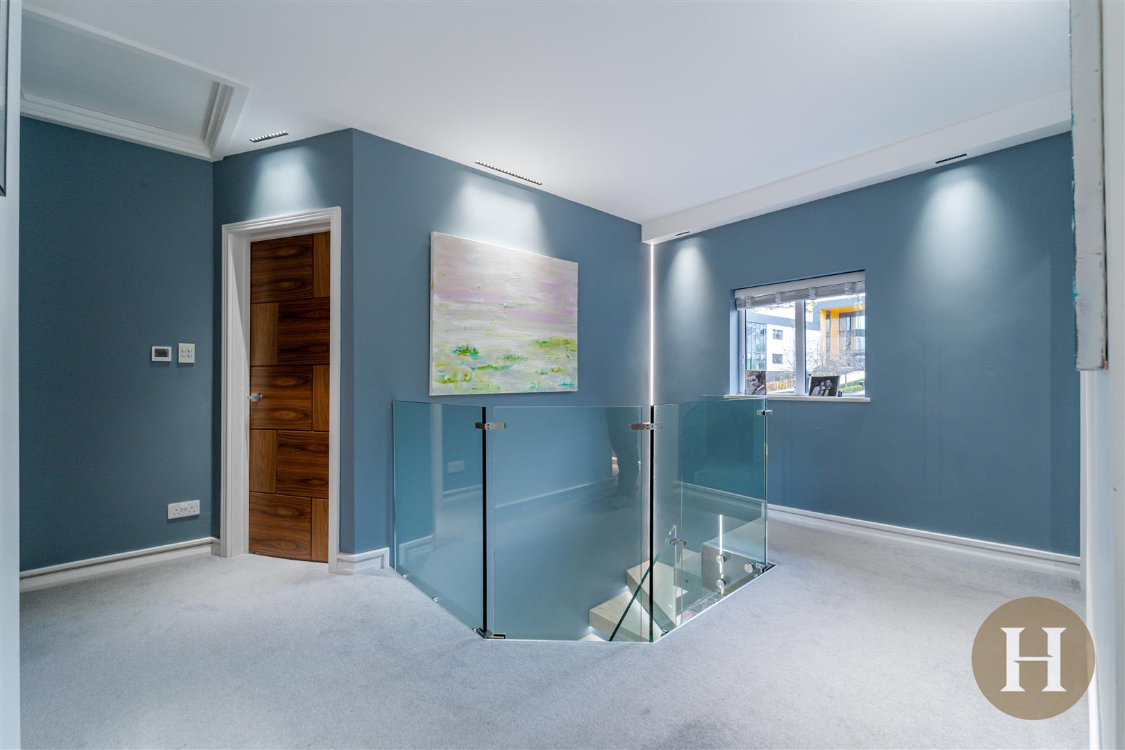 Landing - Spacious and open landing, with glass balustrade, double glazed window to the front elevation. Wall and ceiling LED lighting and central heating radiator.