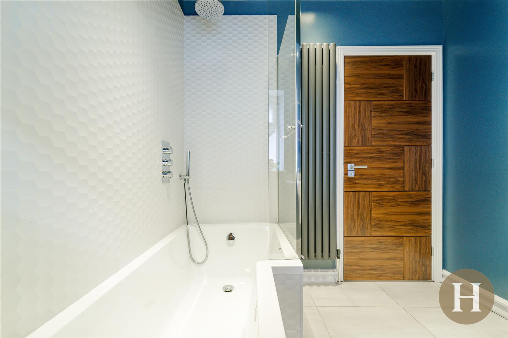 Bathroom - Family bathroom offering shower over bath, low level flush WC and hand wash basin. Window to the side elevation, LED ceiling lighting, central heating radiator, tiled flooring and partially tiled wall.