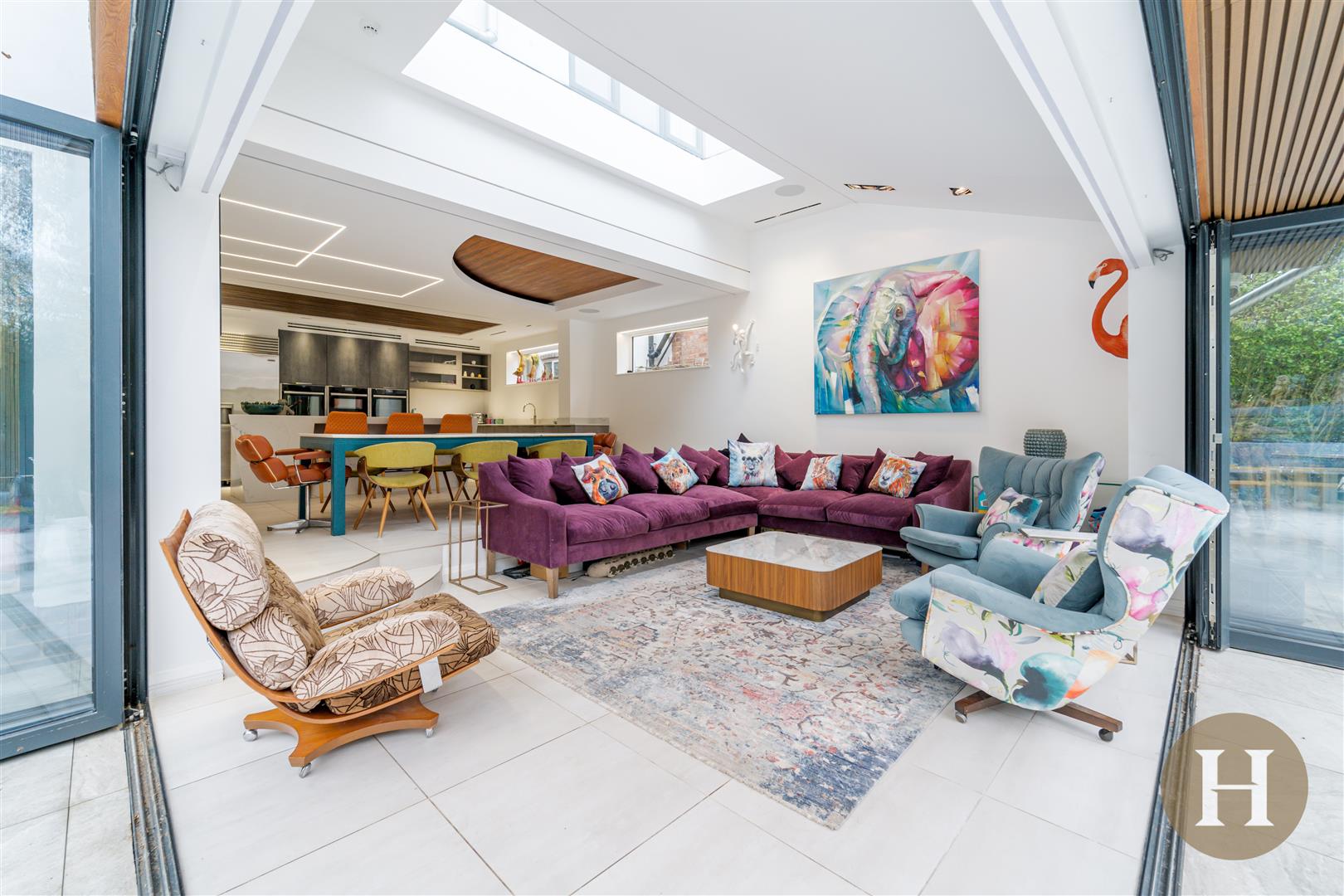 Lounge - Feature skylight, recessed downlights and LED lighting. Double glazed windows to the side elevation, tiled underfloor heating, built in sound system and bespoke open corner bi-fold doors.
