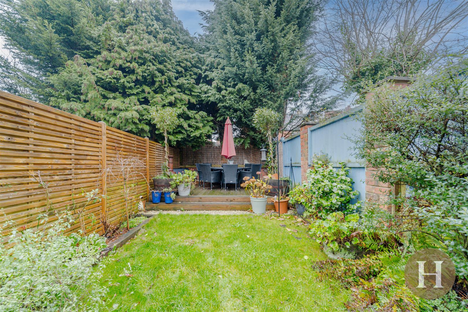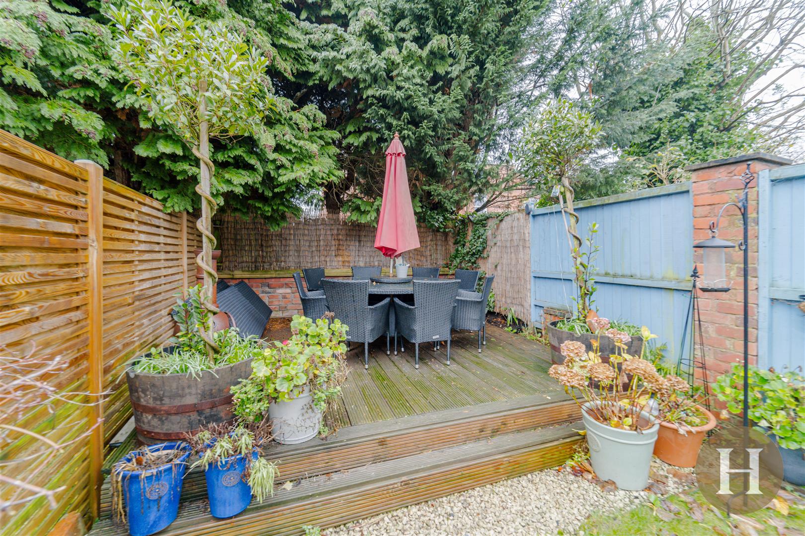 Garden - Private garden with traditional outhouse, blue brick paving and predominantly laid to lawn. Rear decking area and fenced boundaries.