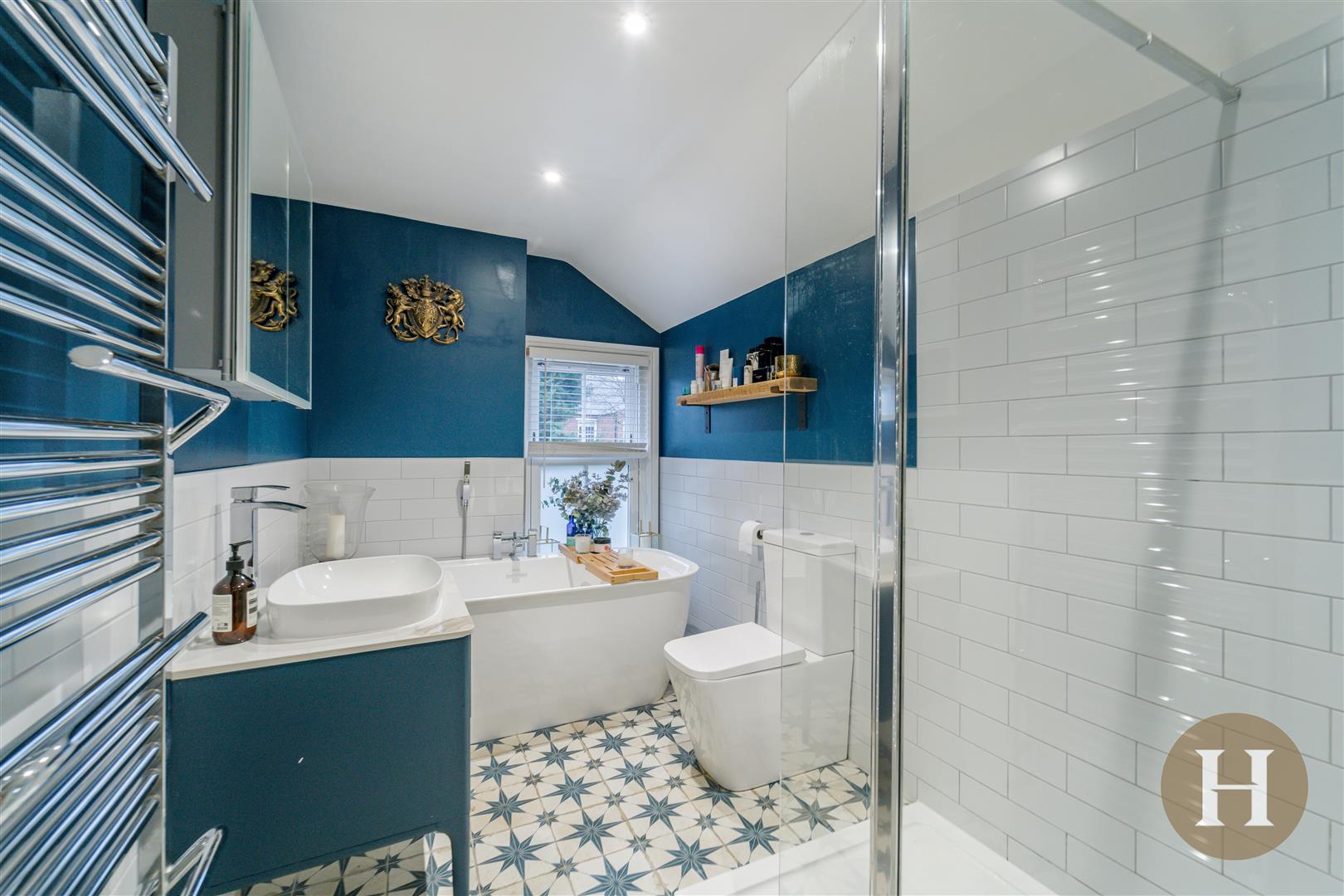 Bathroom - Modern bathroom suite boasting freestanding bath and shower attachment. Walk in shower cubicle, low level flush WC, vanity unit and towel radiator. Partially obscure glazed window to the rear elevation, tiled flooring and walls, ceiling spotlights. The bathroom further benefits from underfloor heating.