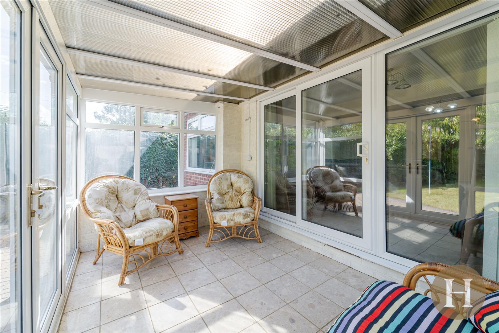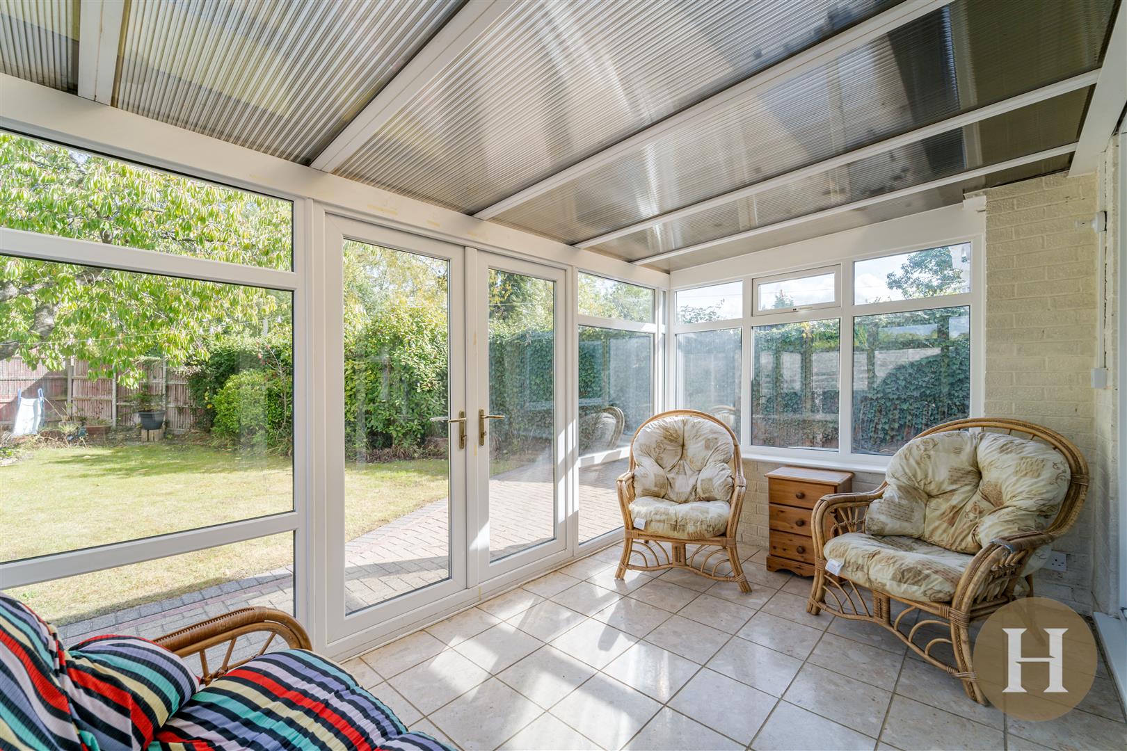 Conservatory - UPVC double glazed conservatory with double doors leading to the garden and wall lights.