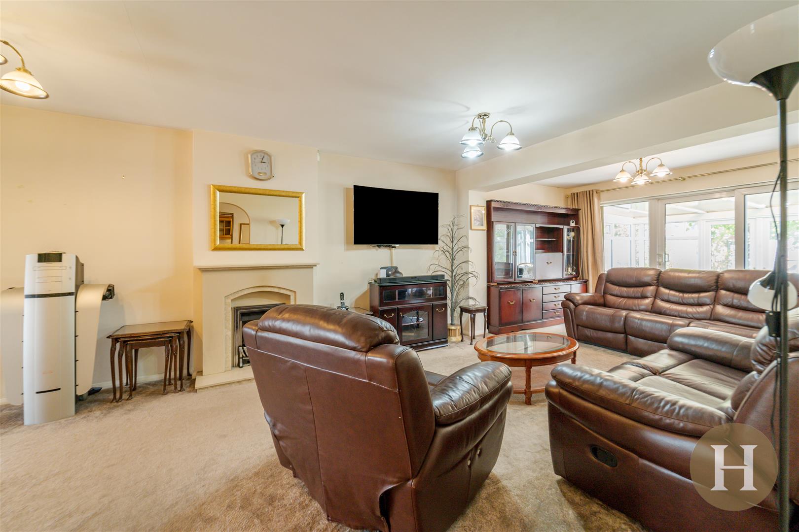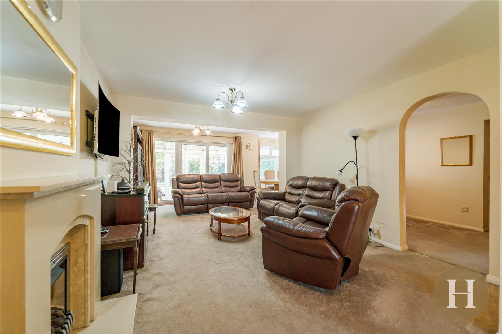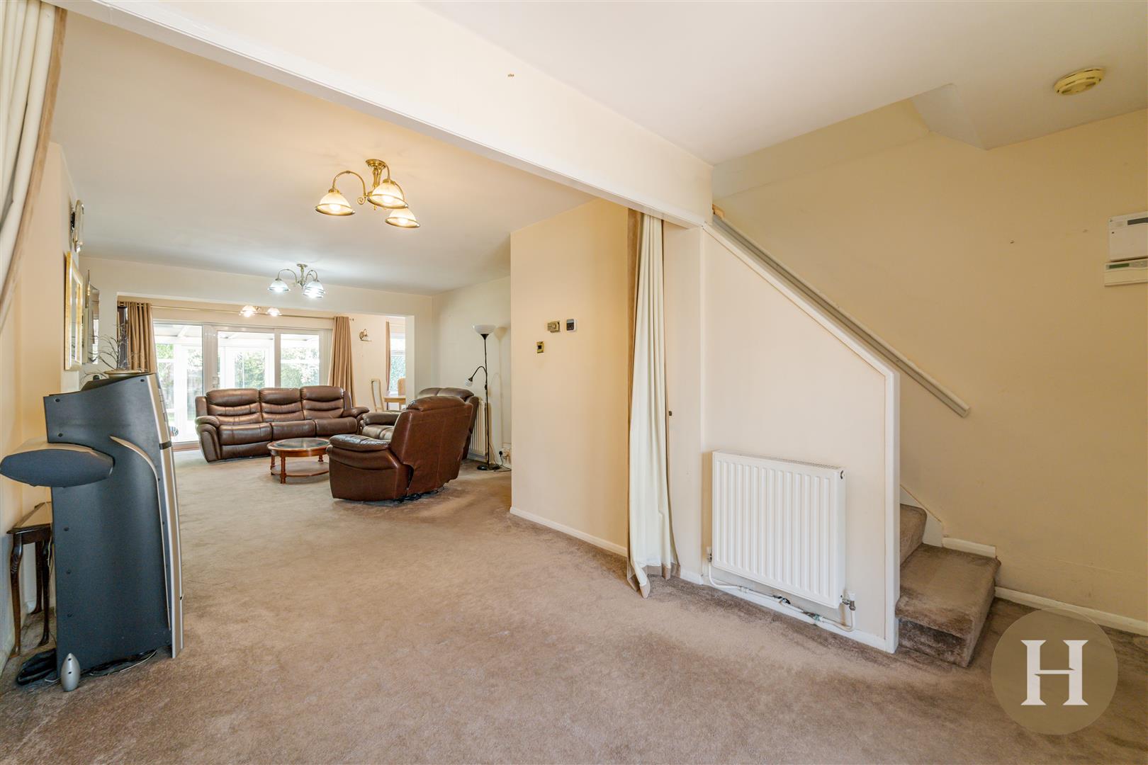 Lounge - Spacious through lounge boasting feature fireplace, two ceiling light points and central heating radiator. Being open and leading through to the dining area and conservatory. Along with offering access to an additional reception room and understairs storage.