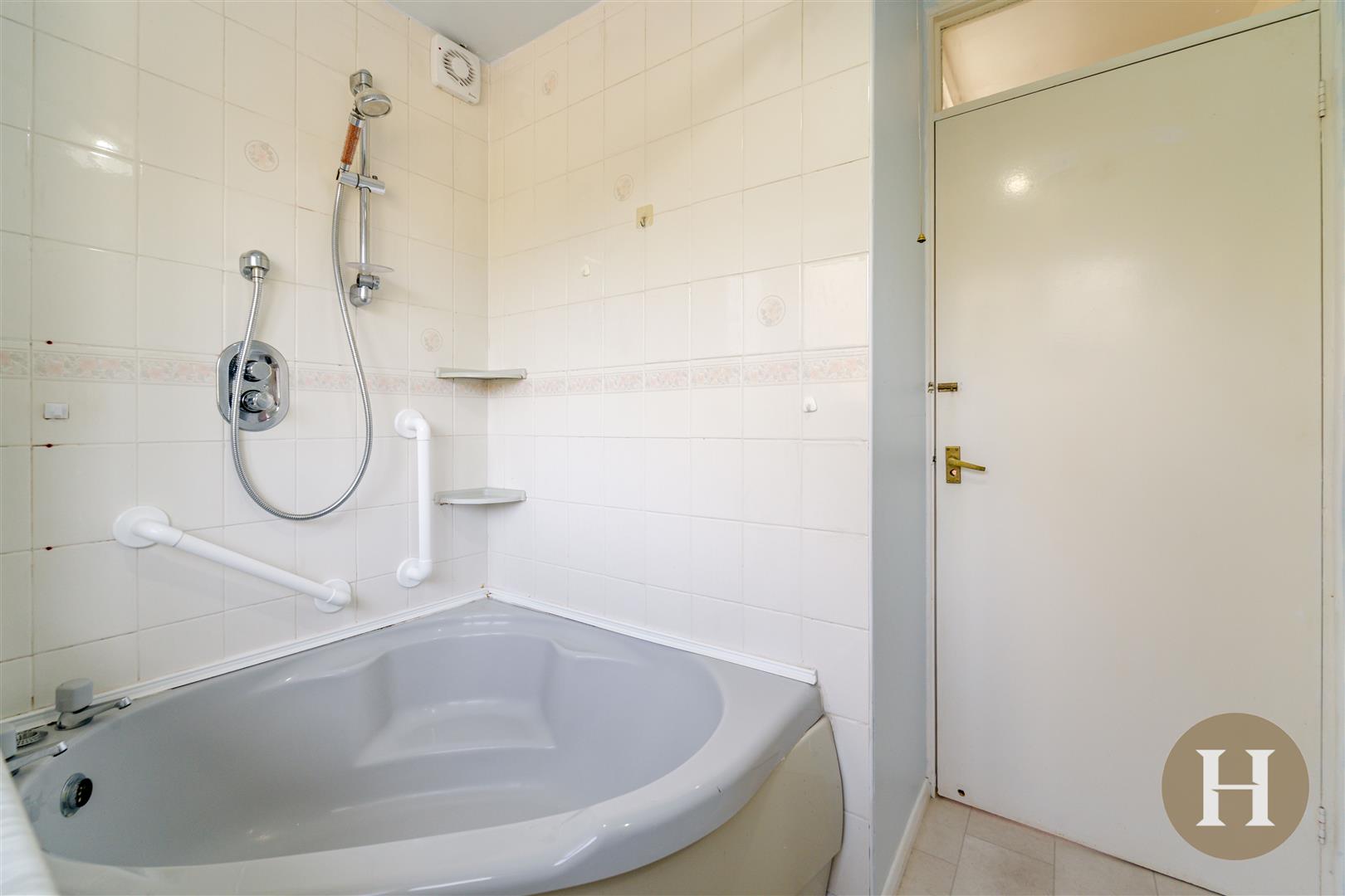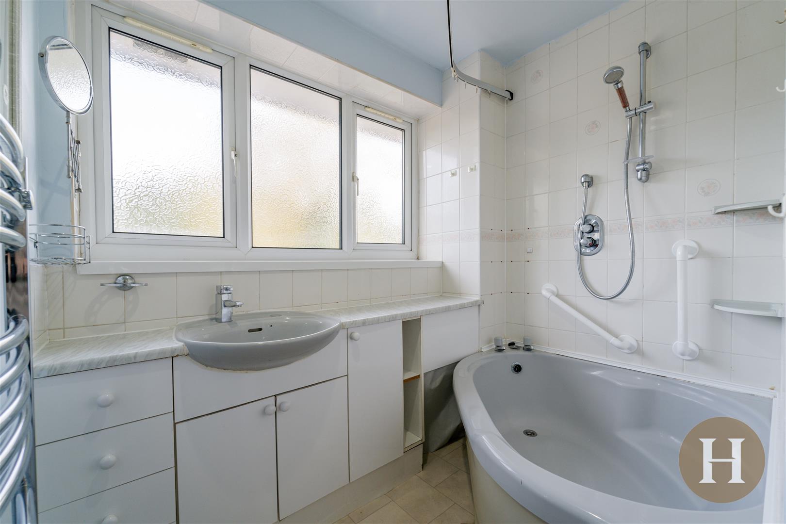 Bathroom - Partially tiled bathroom suite, with corner bath and shower over. Vanity unit including ample storage, towel radiator, opaque window to the rear elevation and ceiling light point.