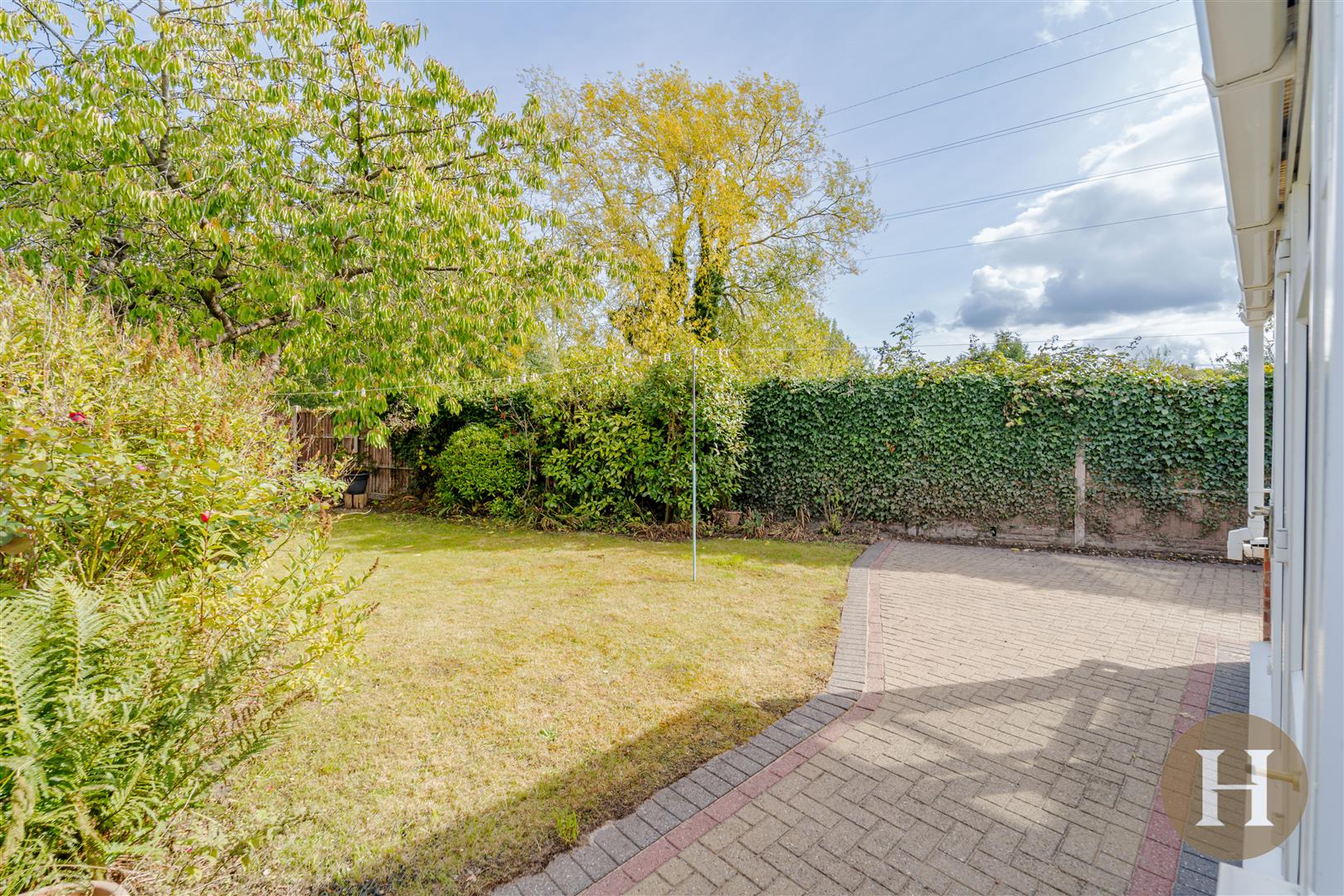 Garden - Block paved patio area, with garden predominantly laid to lawn.