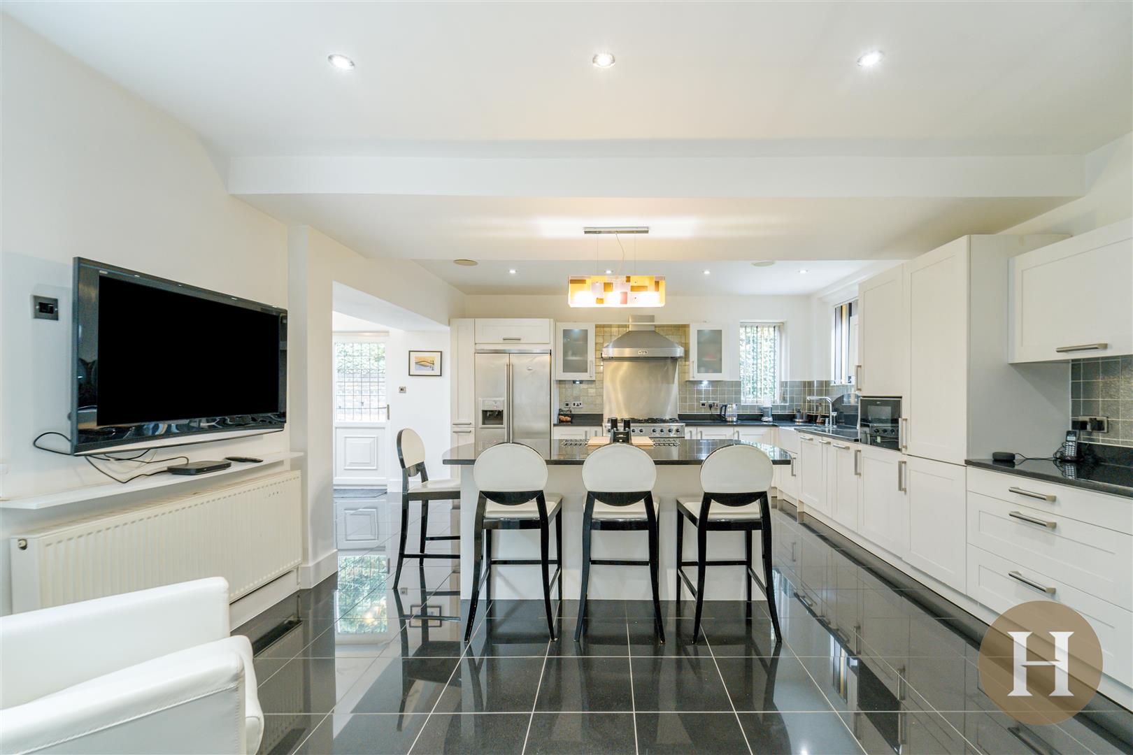 The property includes a grand entrance hall leading to a spacious and bespoke designed kitchen with seating and dining area. Boasting three garden facing reception rooms with the centre piece of a welcoming living room. Downstairs also benefits from utility room, guest WC and adjacent cloak room.