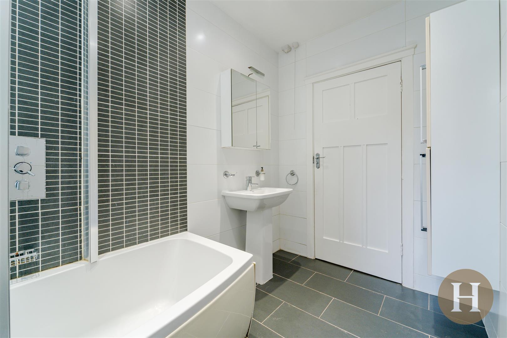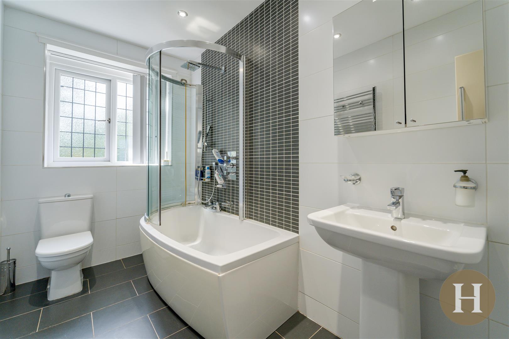 Family Bathroom - Curved bath with shower above complete with circular cubicle, low level WC, pedestal sink, tiled, heated towel rail, obscure glazed window, recessed ceiling down lighters, fully tiled.