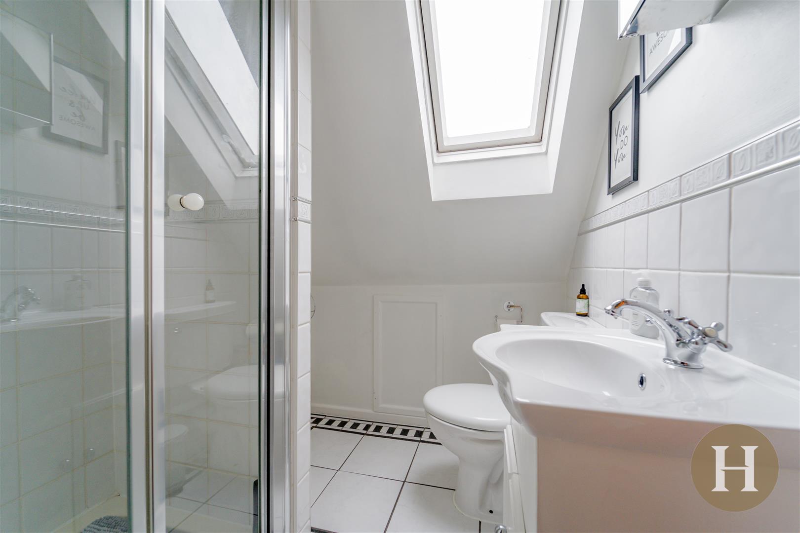 Bathroom - Low level flush WC, vanity unit, tiled flooring and partially tiled walls. Walk in shower cubicle with mains shower, skylight and towel radiator.