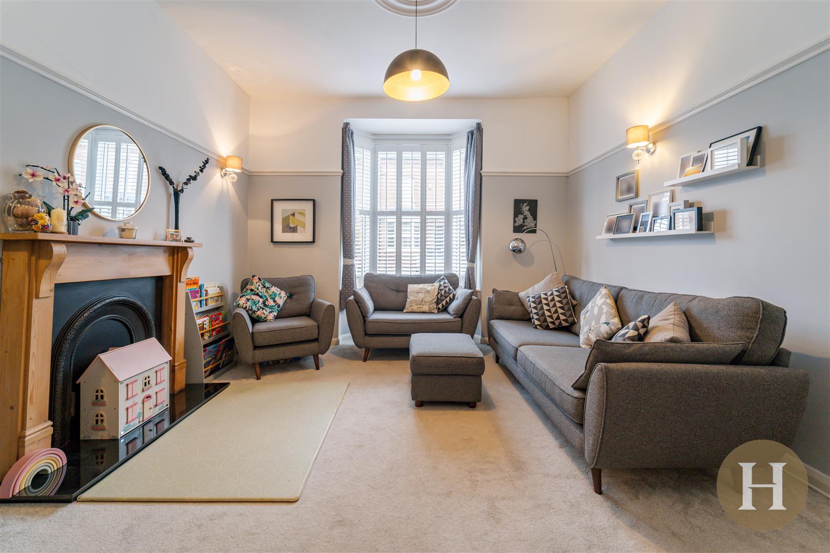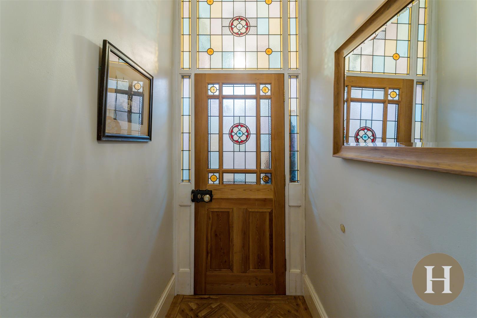Porch/ Hallway - Entrance porch boasting solid wood front door, partially glazed stained glass internal door and stained glass window over. Parquet flooring, central heating radiator, ceiling light and wall lights. Decorative plaster arch, stairs to first floor and access to converted cellar.